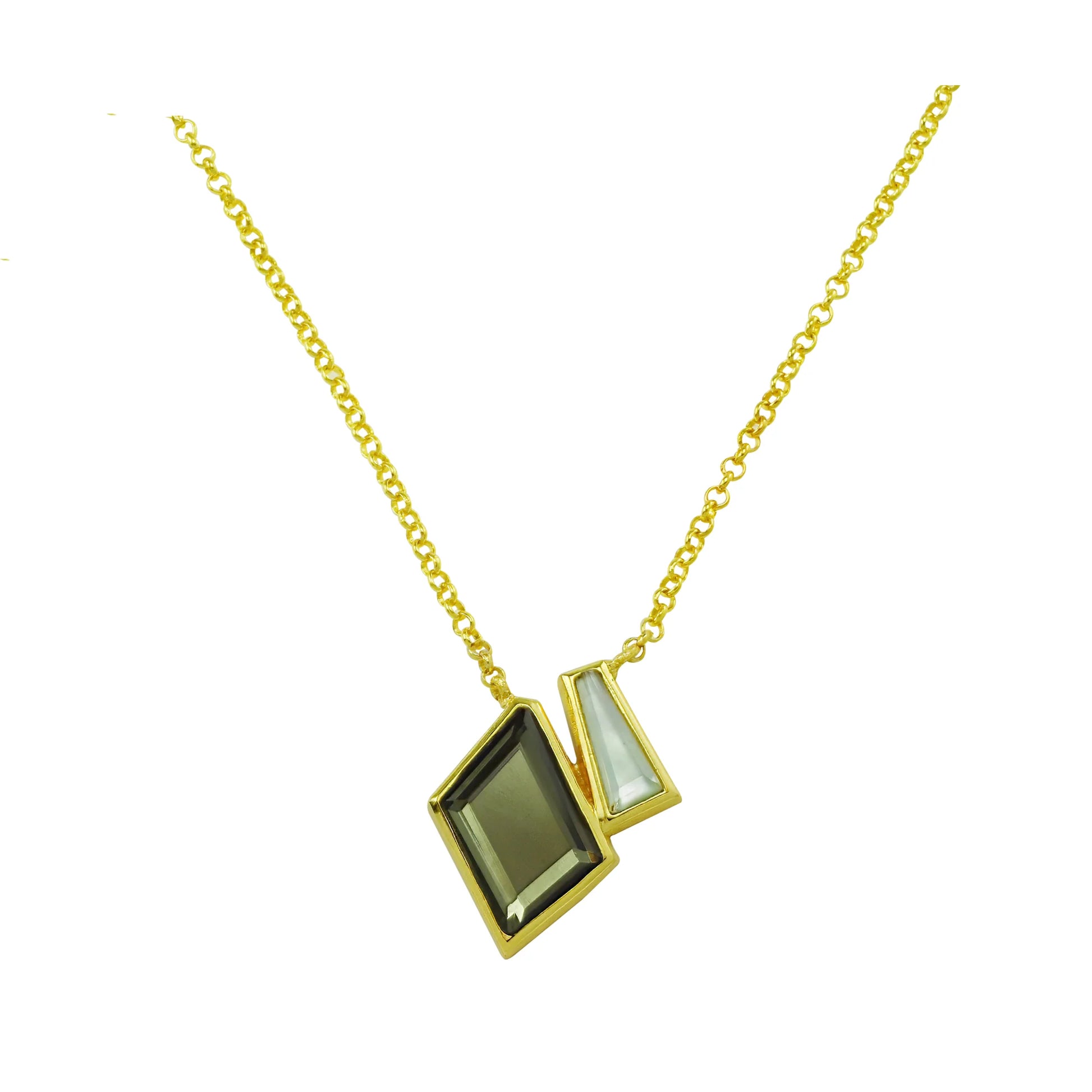 Elevate your look with our Aziz Necklace. Featuring a geometric two stone pendant design, this necklace is plated with 18k gold for a luxurious touch. The pendant measures 1.2" x 0.5" and hangs on a 16" chain, making it the perfect accessory for any occasion.