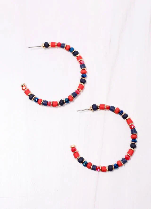 This two tone earring is lined with glass beading, spacer discs, and gold accents on a post back. Wear to your next game day function for an eye-catching look!