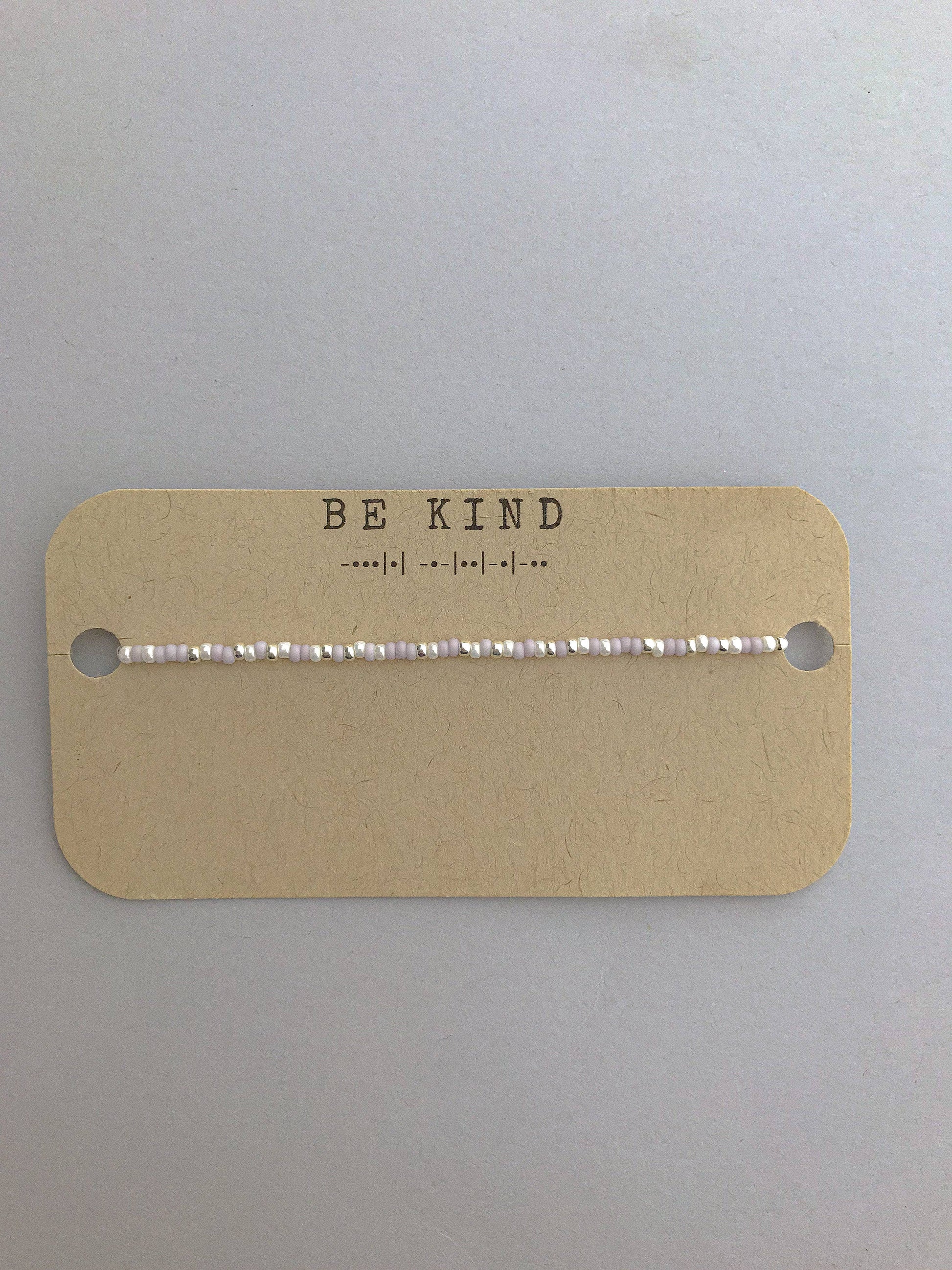 Our Morse code bracelets are more than just accessories. Their pattern holds meaning and purpose. Each color of bead represents the dots, dashes, and spaces in international Morse code. This bracelet features matte light purple, pearlescent white, and sterling silver plated 11/0 seed beads. Choose Small, Medium, Large: