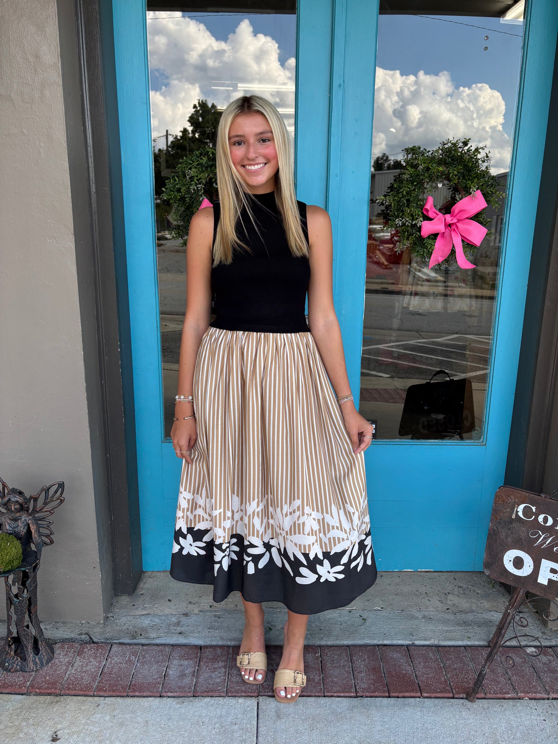 This beautifully neutral dress features a black knit bodice paired with a soft cotton skirt in beige and cream tones, offering a comfortable and stylish look perfect for any occasion.