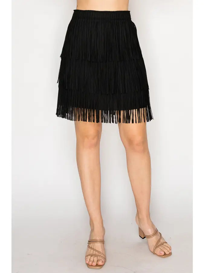 Playful black mini skirt with flirty fringe detail that sways with every step. Perfect for nights out, festivals, or adding movement to any outfit. Pairs easily with tops and jackets for versatile styling.