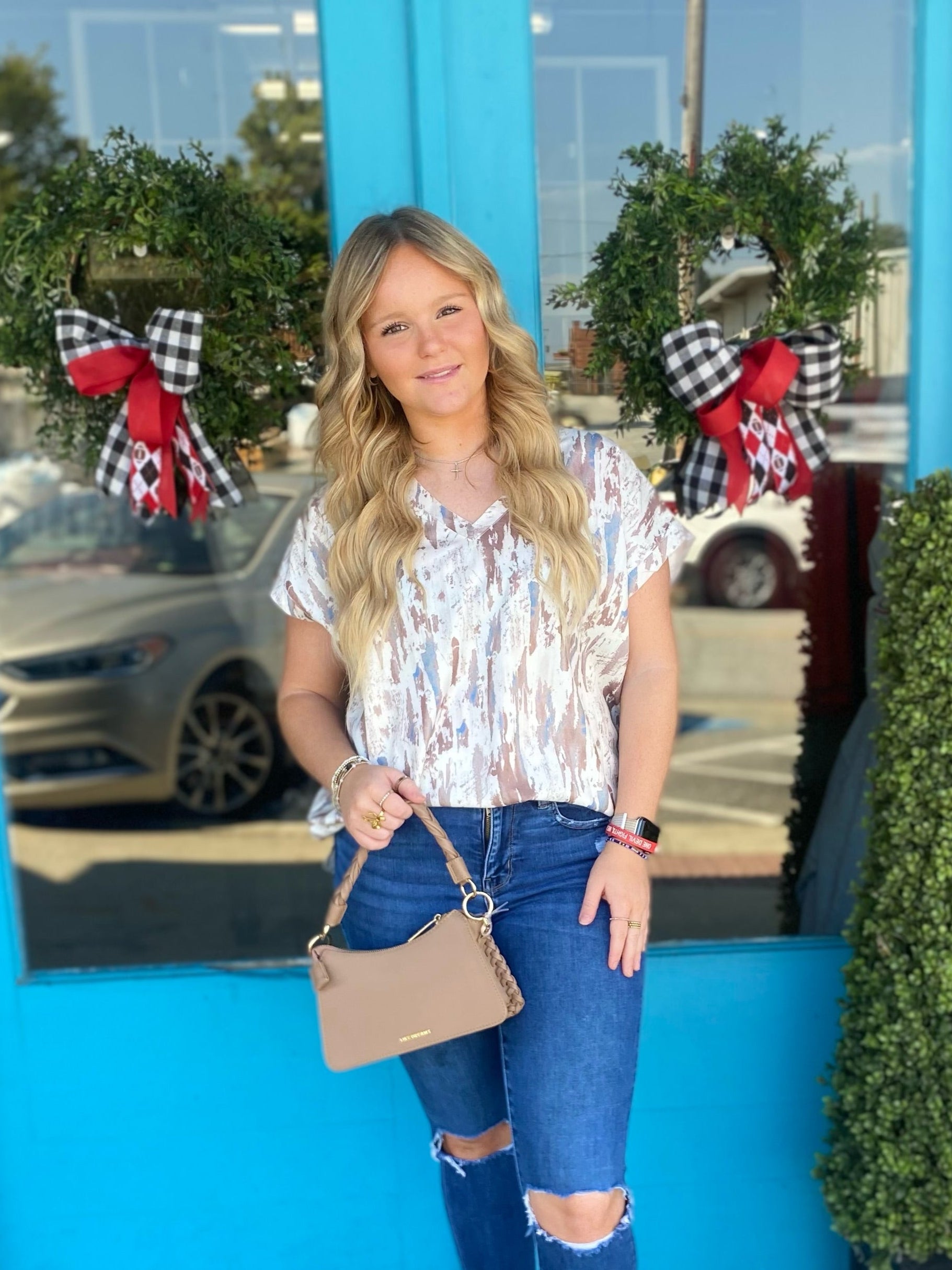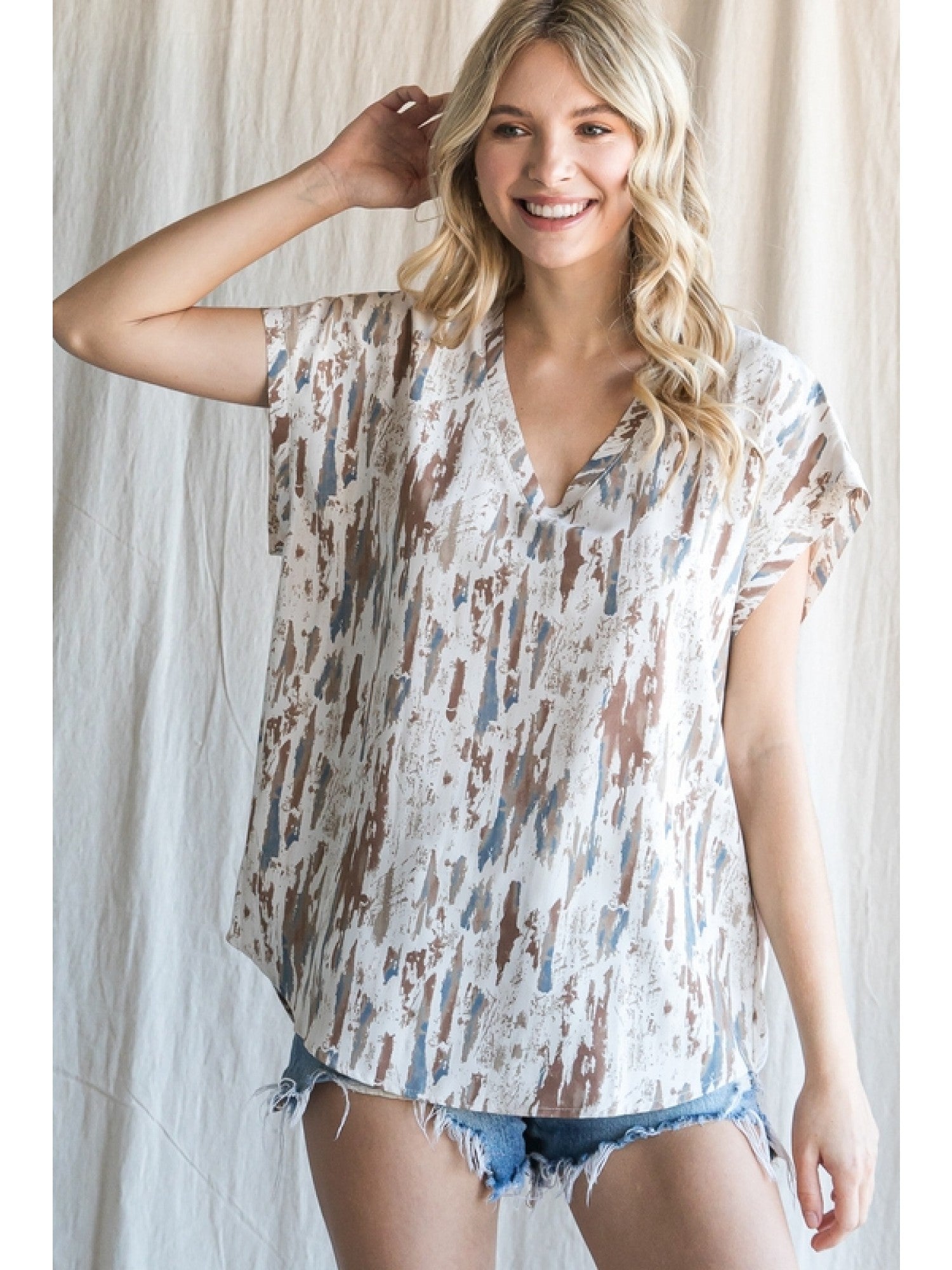 Callie's Casual Print Top features a relaxed fit with a flowy silhouette, a flattering V-neckline, and cuffed short dolman sleeves for comfortable, stylish wear.
