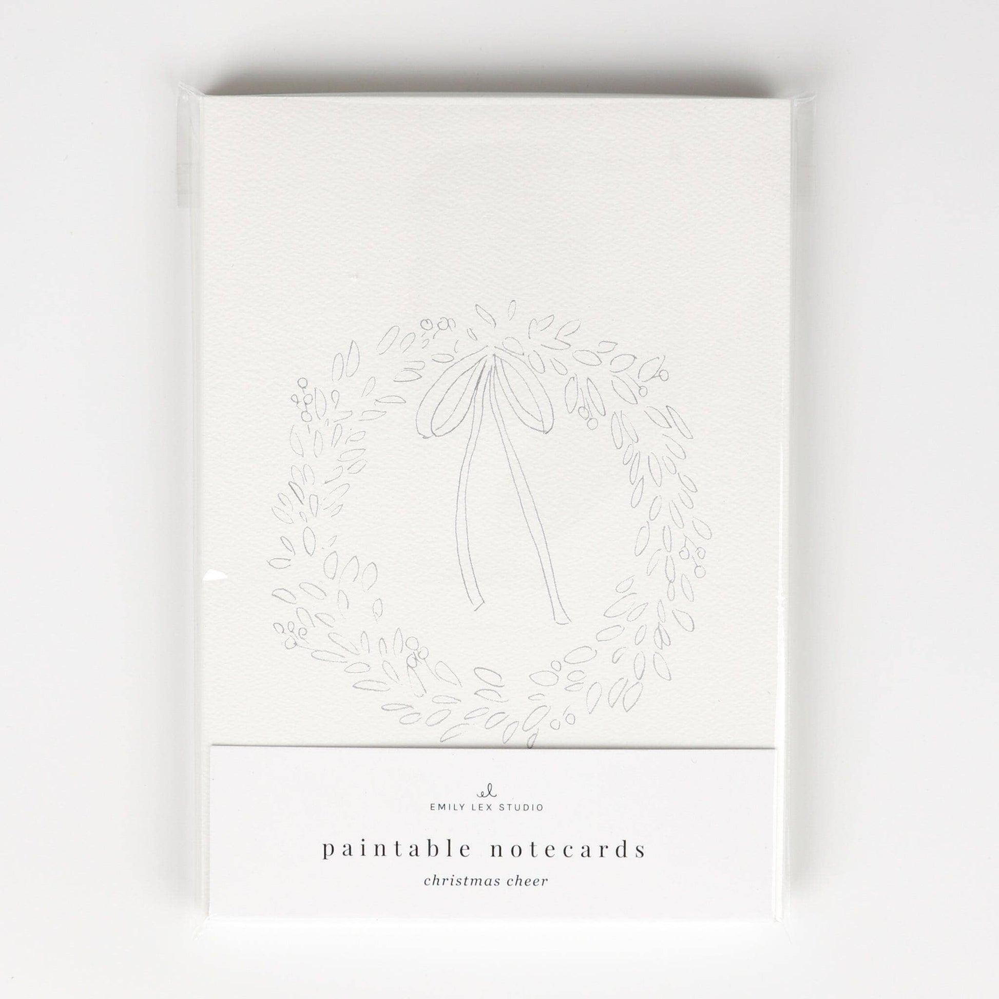 Paint your own special Christmas cards to send to loved ones this year! Sketches are printed on the front of each card with simple instructions for you to paint in with watercolors. You'll receive eight cards with two of each illustration: wreath, snowglobe, gifts, Christmas tree truck. Perfect for artists of all ages! Details: - set of eight paintable notecards + envelopes - two of each illustration lightly sketched for you to paint - blank inside - 5" x 7" - Original watercolor artwork by Emily Lex
