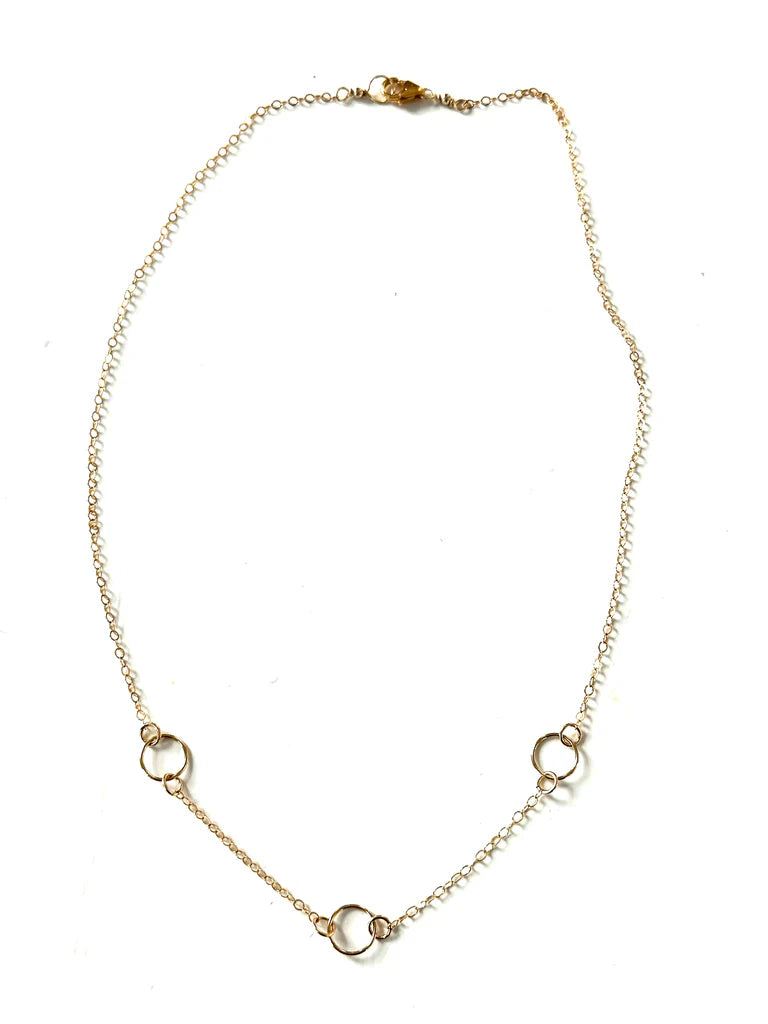 Effortlessly elevate any outfit with cv designs' Triple Circle necklace. This 16" piece features three circles, crafted with 16k gold filled material for a luxurious touch. Perfect for adding a touch of sophistication and elegance to your everyday look.