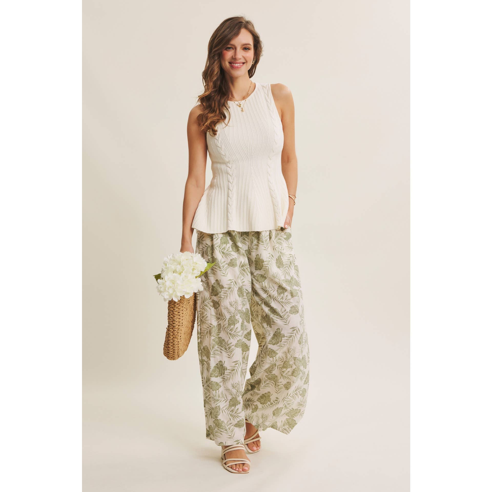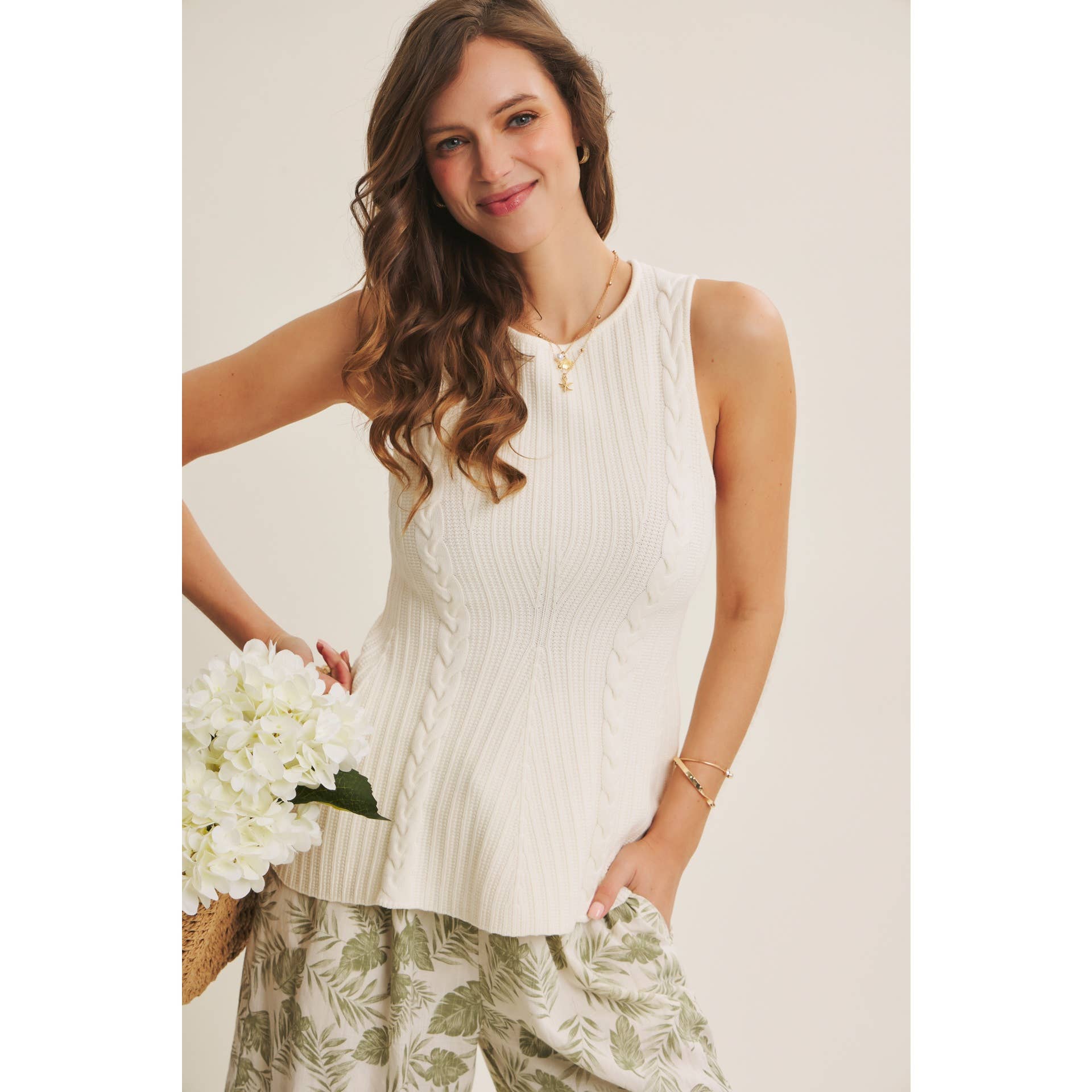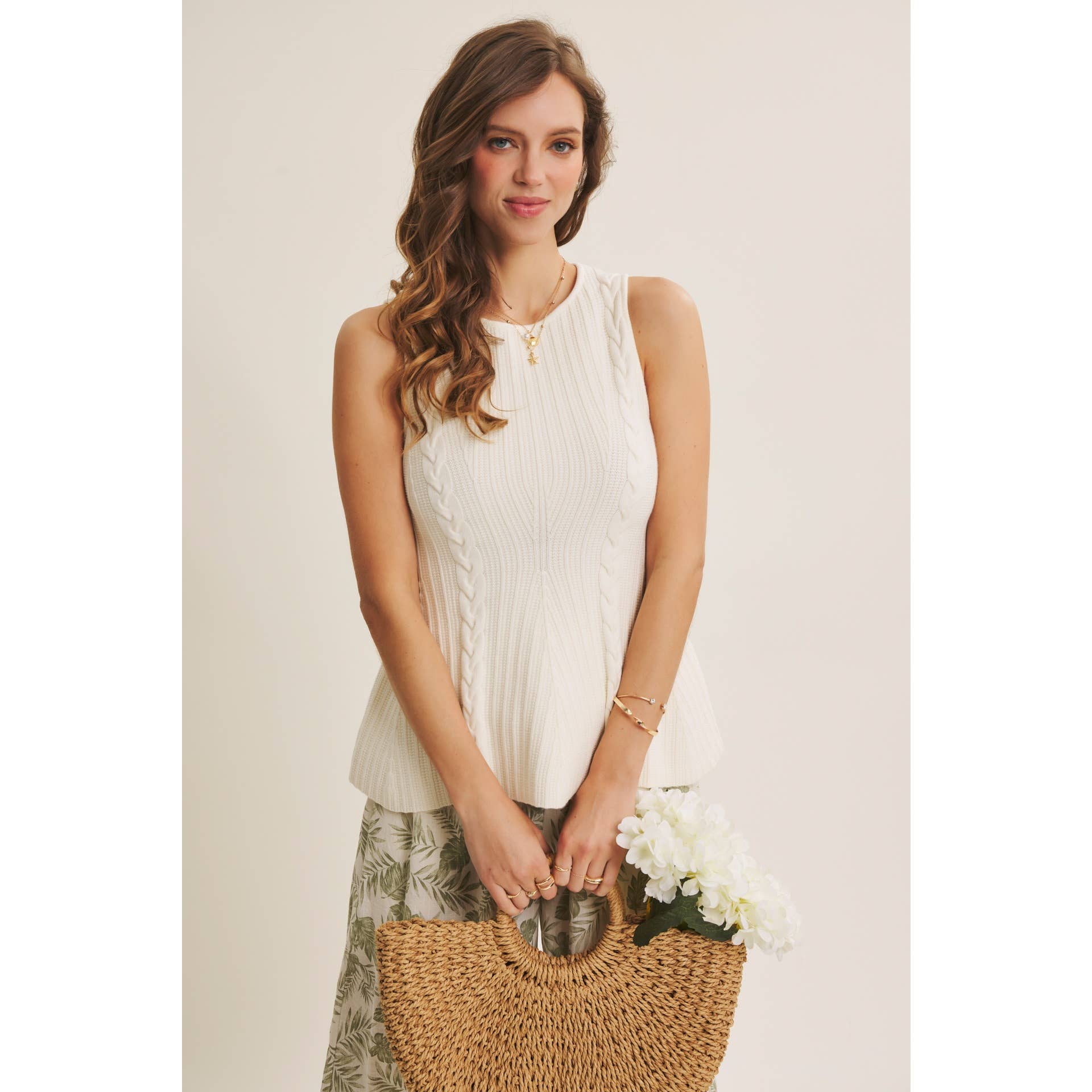 Effortless layering piece with a textured cable knit design and flattering peplum hem. The sleeveless silhouette and round neckline make it perfect for pairing over tees or under jackets. Soft, structured fabric creates a polished look with subtle movement and dimension.