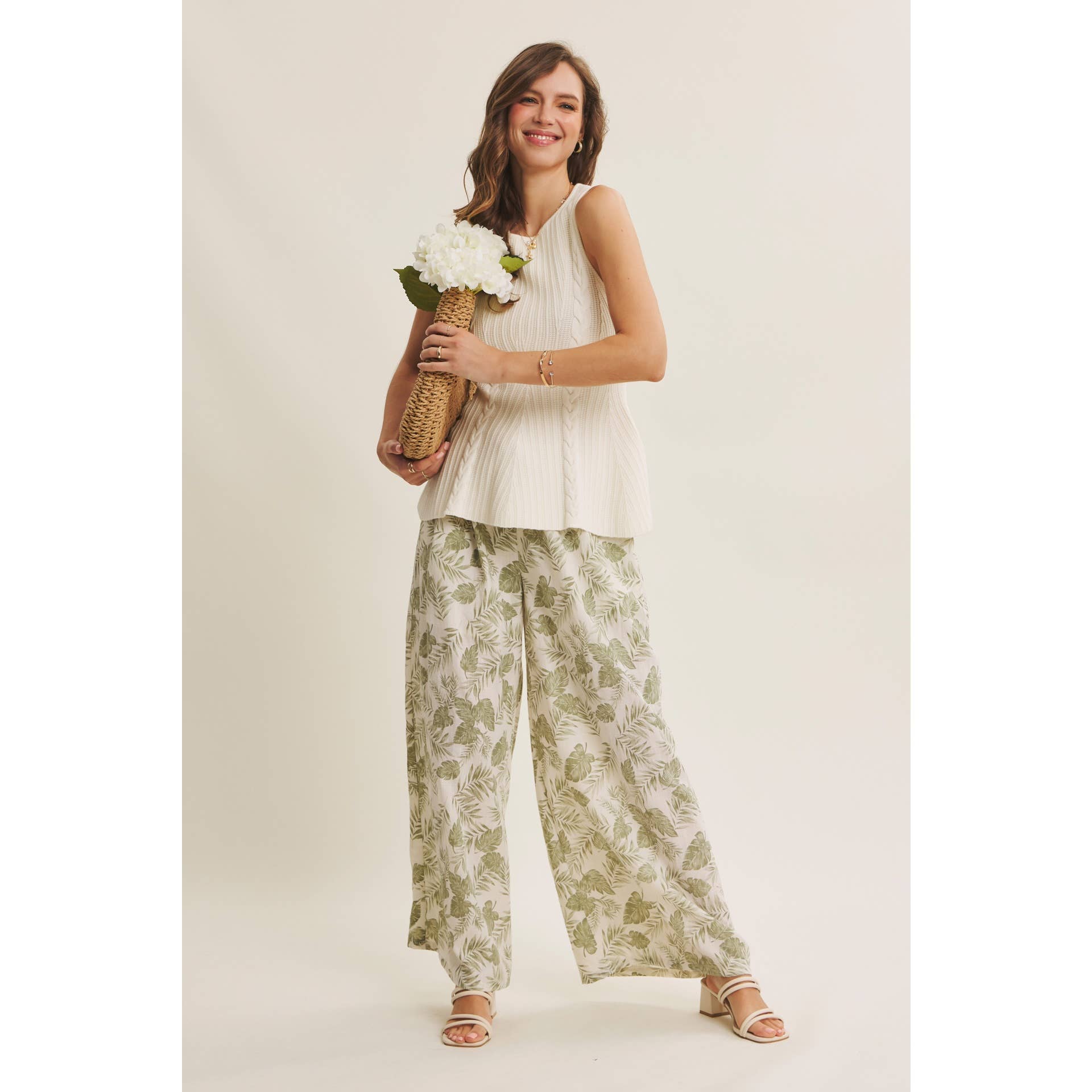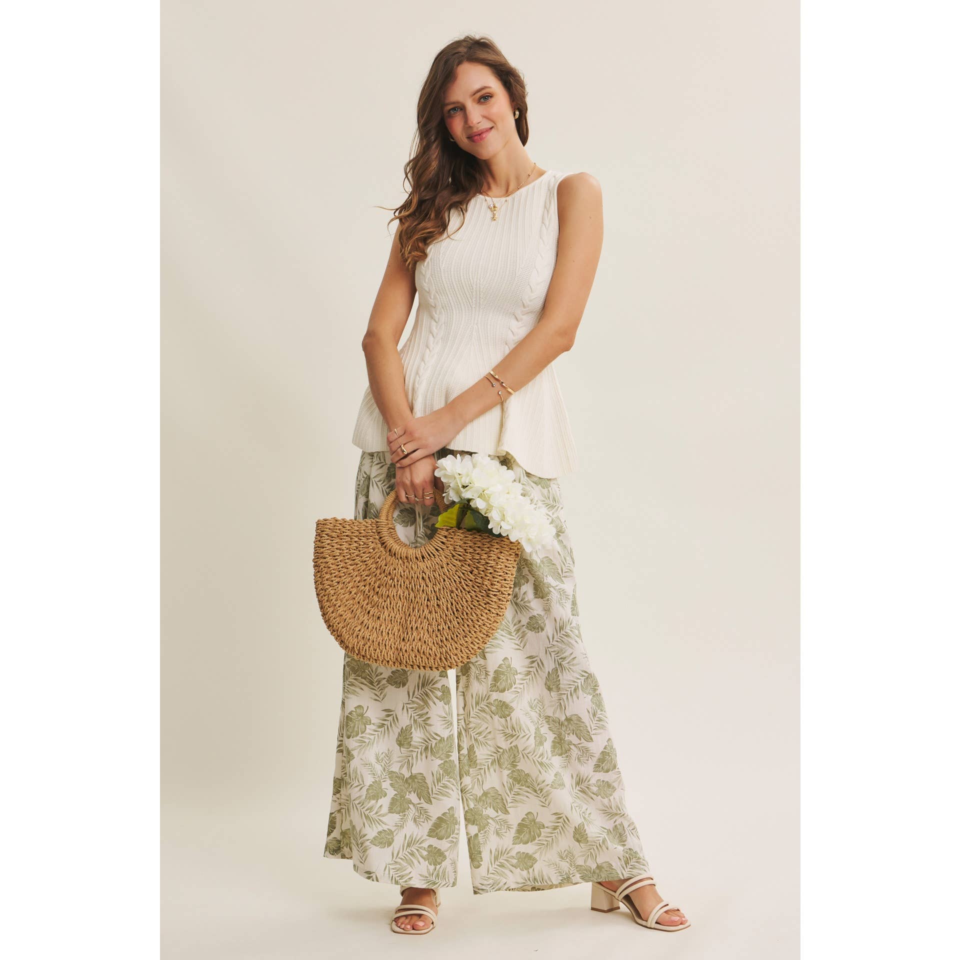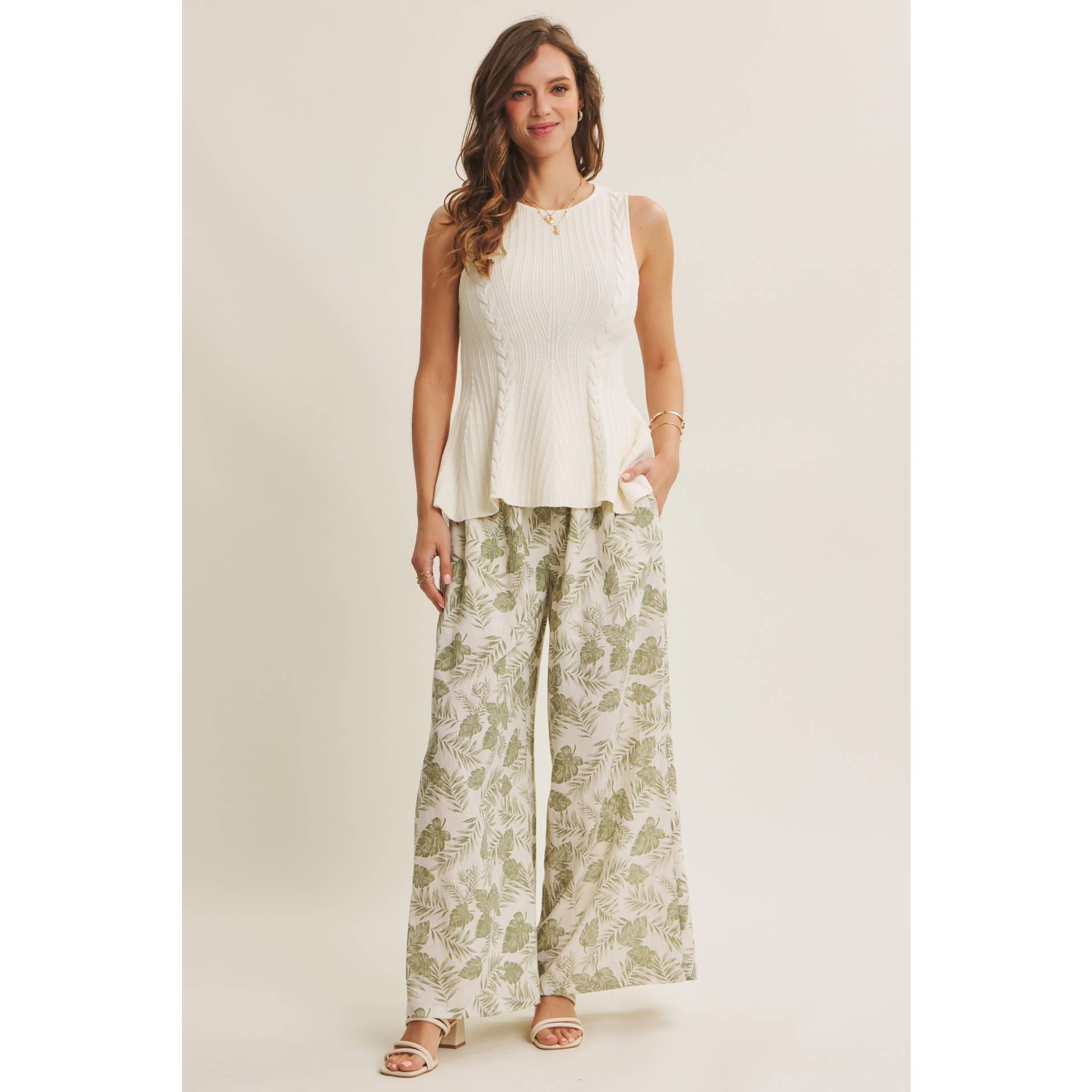 Effortless layering piece with a textured cable knit design and flattering peplum hem. The sleeveless silhouette and round neckline make it perfect for pairing over tees or under jackets. Soft, structured fabric creates a polished look with subtle movement and dimension.