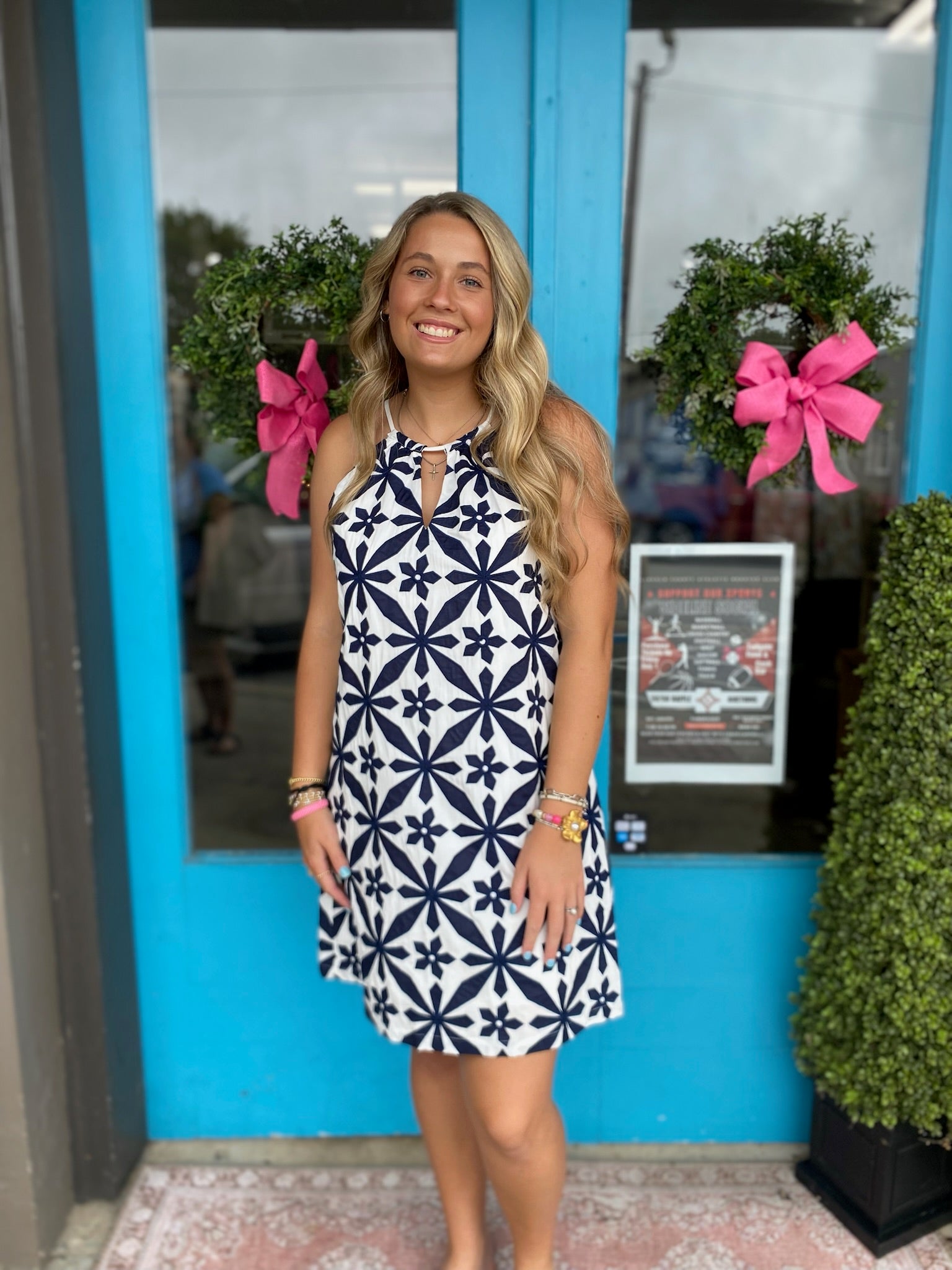 This navy and white halter dress features delicate embroidery on soft cotton fabric, offering a comfortable and stylish choice for warm days. Its classic design pairs effortlessly with casual or dressy looks.