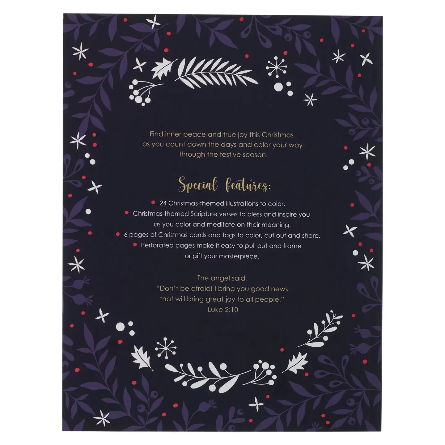 Color your way through the Advent season with the Good News of Great Joy Advent Coloring Book. Find inner peace and true joy this Christmas as you count down the days of the festive season colorfully and creatively. Black background with purple leafy sprigs and white Christmas-themed decorative elements, Gold-foiled title, Good News of Great Joy, Coloring book for adults, Advent coloring book, Softcover, One color interior, 52 pages.