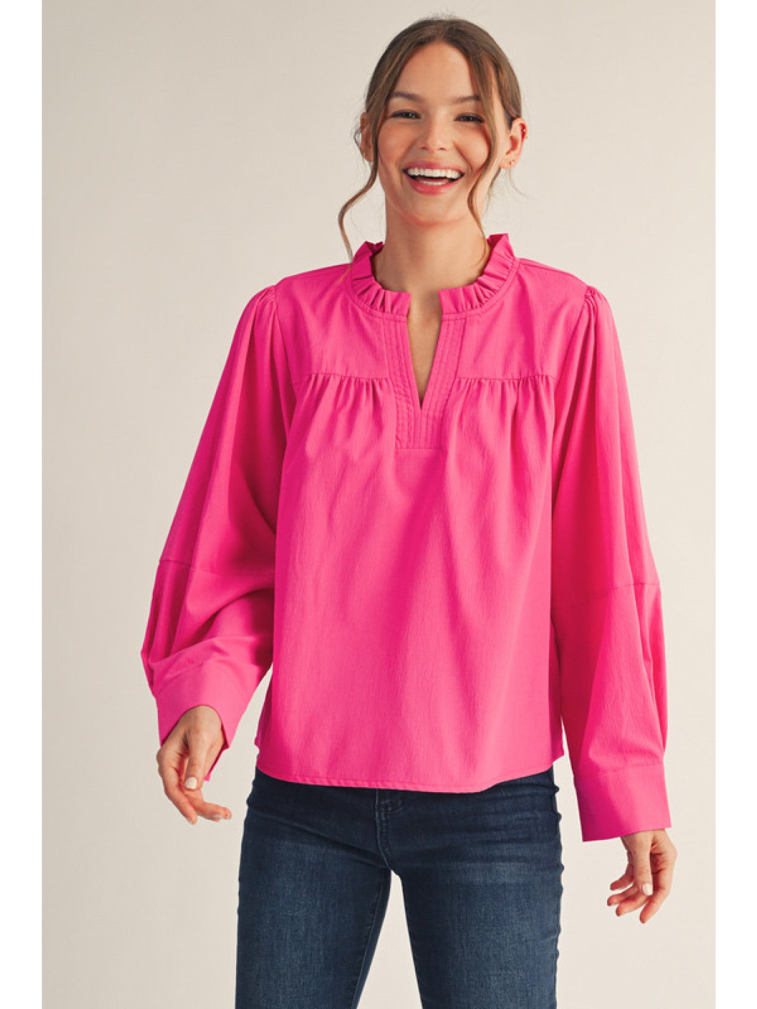 A fun color on this simple and sweet blouse. Long sleeves with ruffled neckline, and button closure cuffs make this a comfy top to take you into the next season.