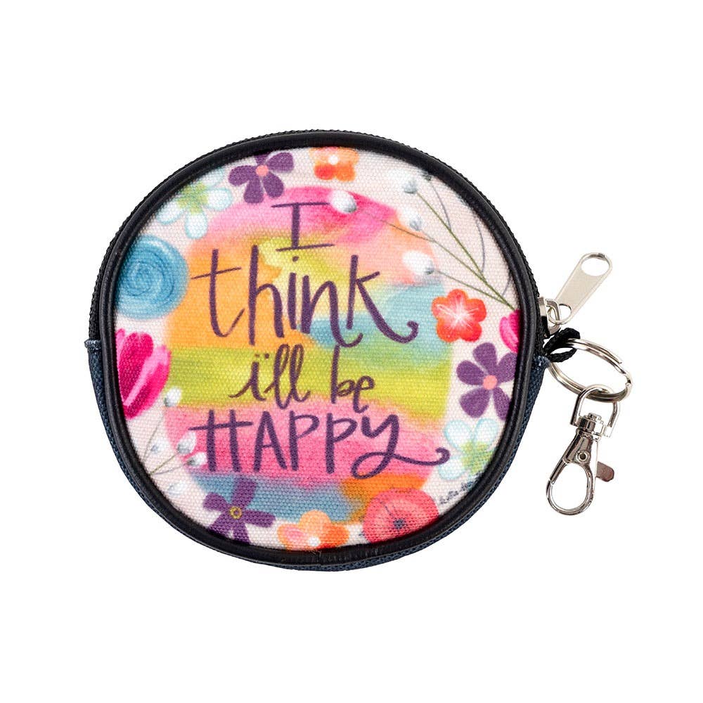 I'll Be Happy Round Coin Purse (4" diameter x ¾" deep) with cotton canvas exterior, polyester lined interior and lobster claw clasp, is fun and practical. Artwork by Katie Doucette.