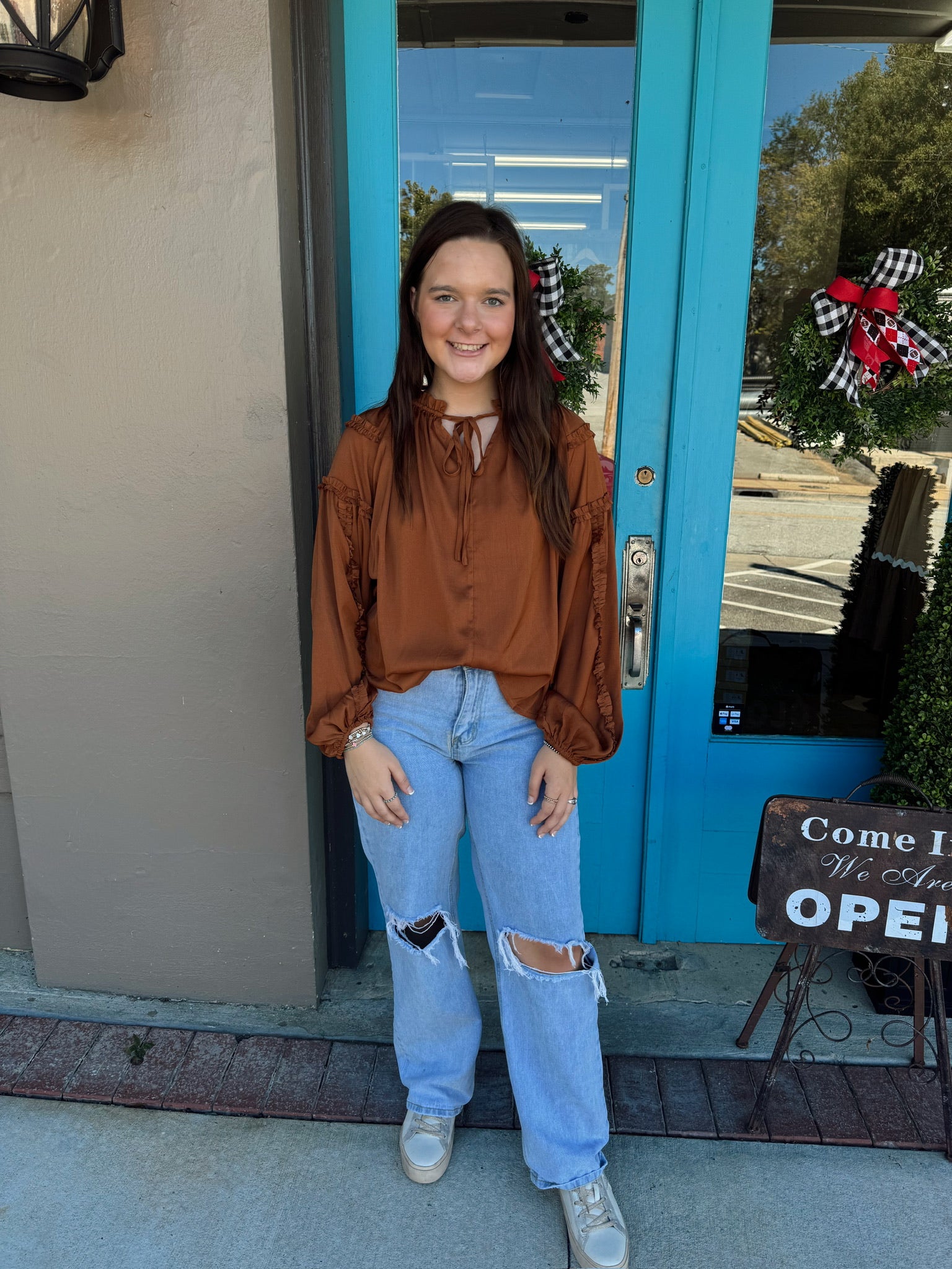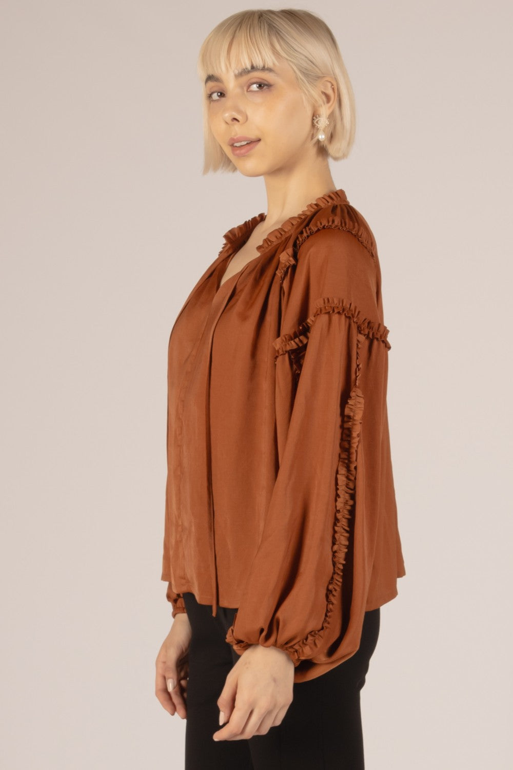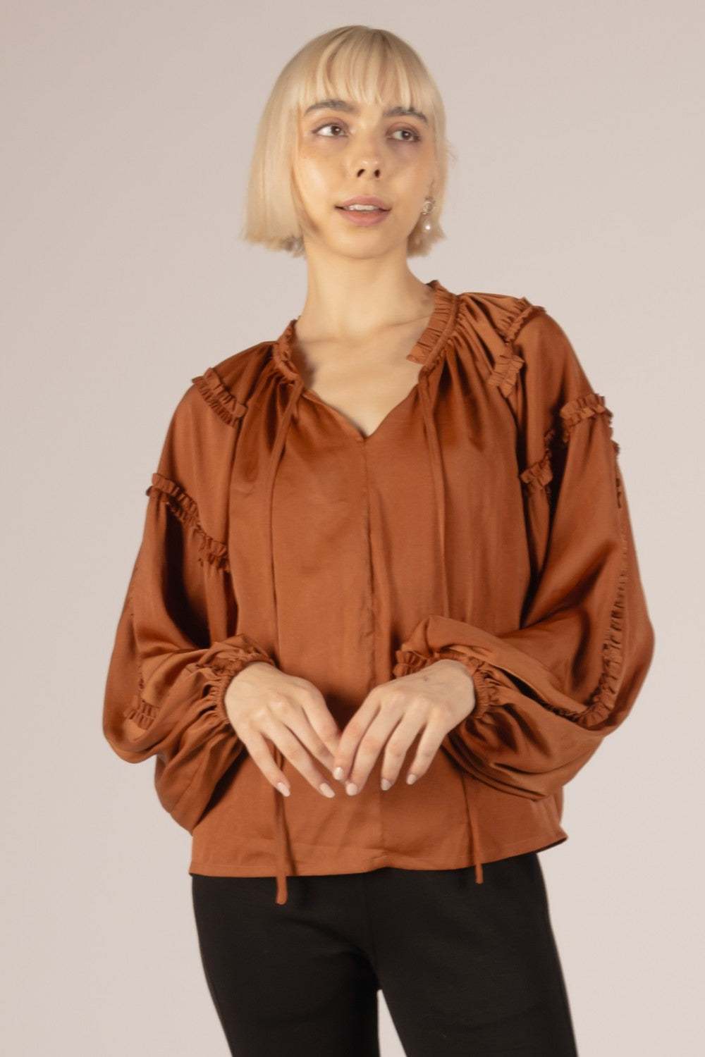 Get ready to stand out in style with Kam's Satin Ruffled Boho Top. Made from silky satin for a luxurious feel, this top features trendy ruffled details and a boho-inspired design. The ruffled neckline with tassels and bishop sleeves add an extra touch of femininity to this must-have piece.