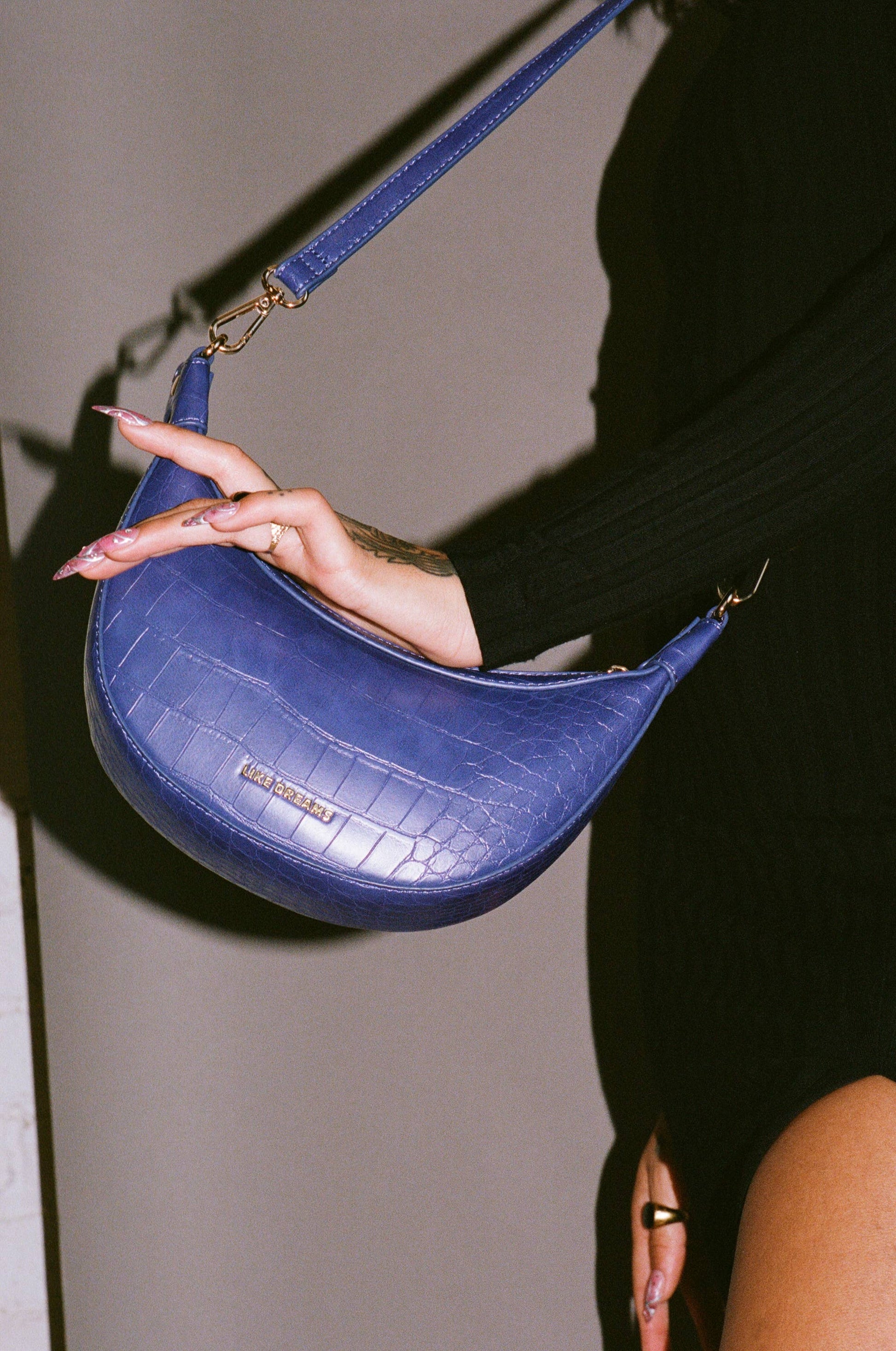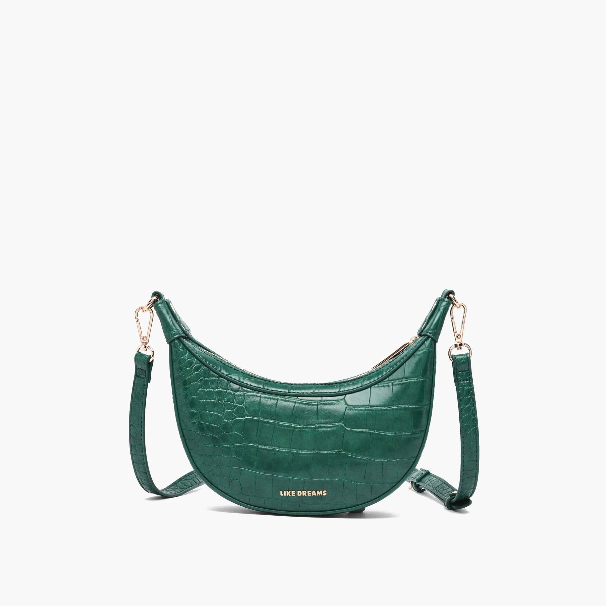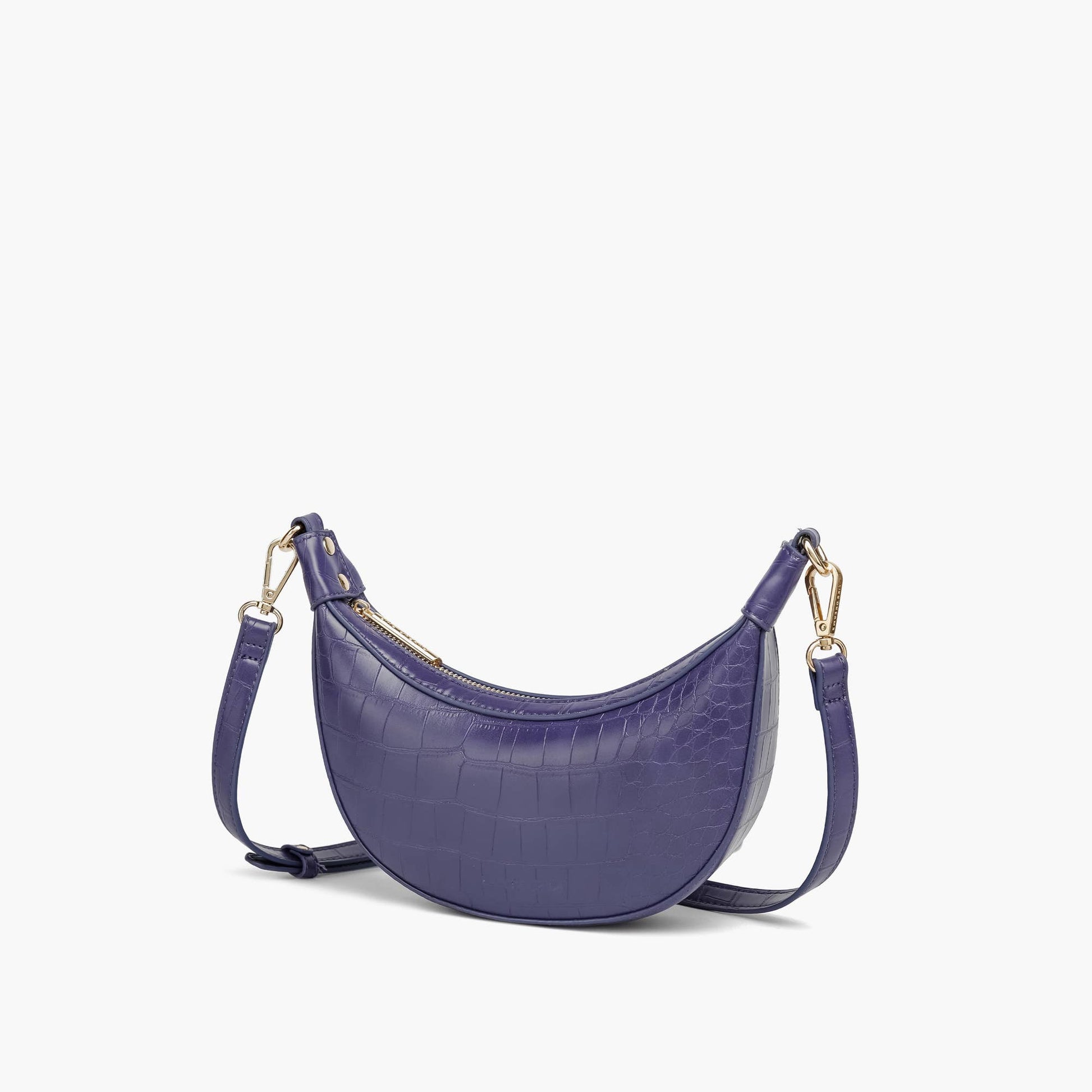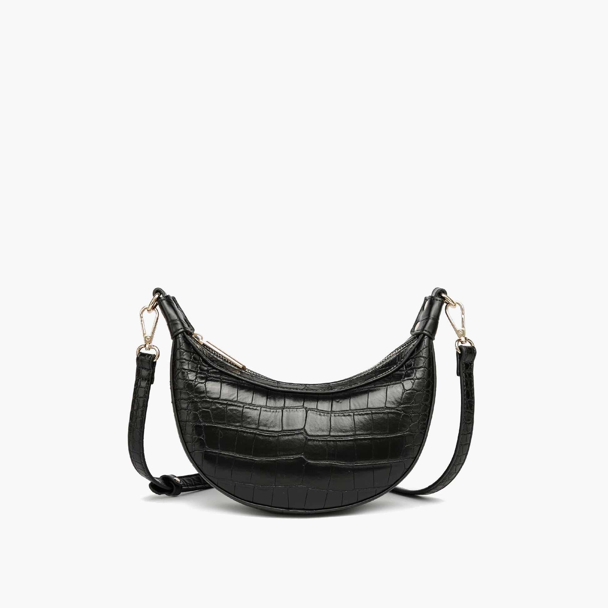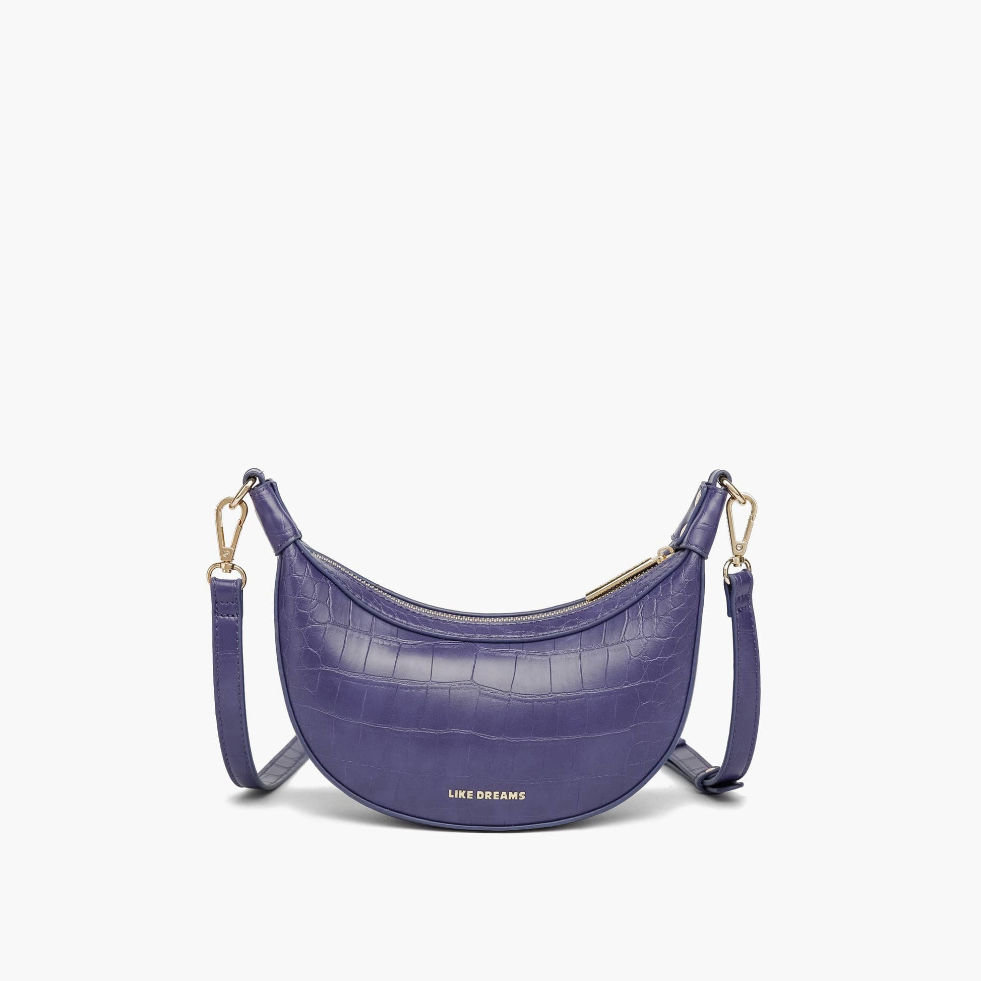 The Kouyou purse is a compact crescent shaped shoulder bag composed of faux croc vegan leather and gold hardware detailing. A detachable strap for crossbody or shoulder bag wear. Single compartment opening. Fits smaller daily essentials.