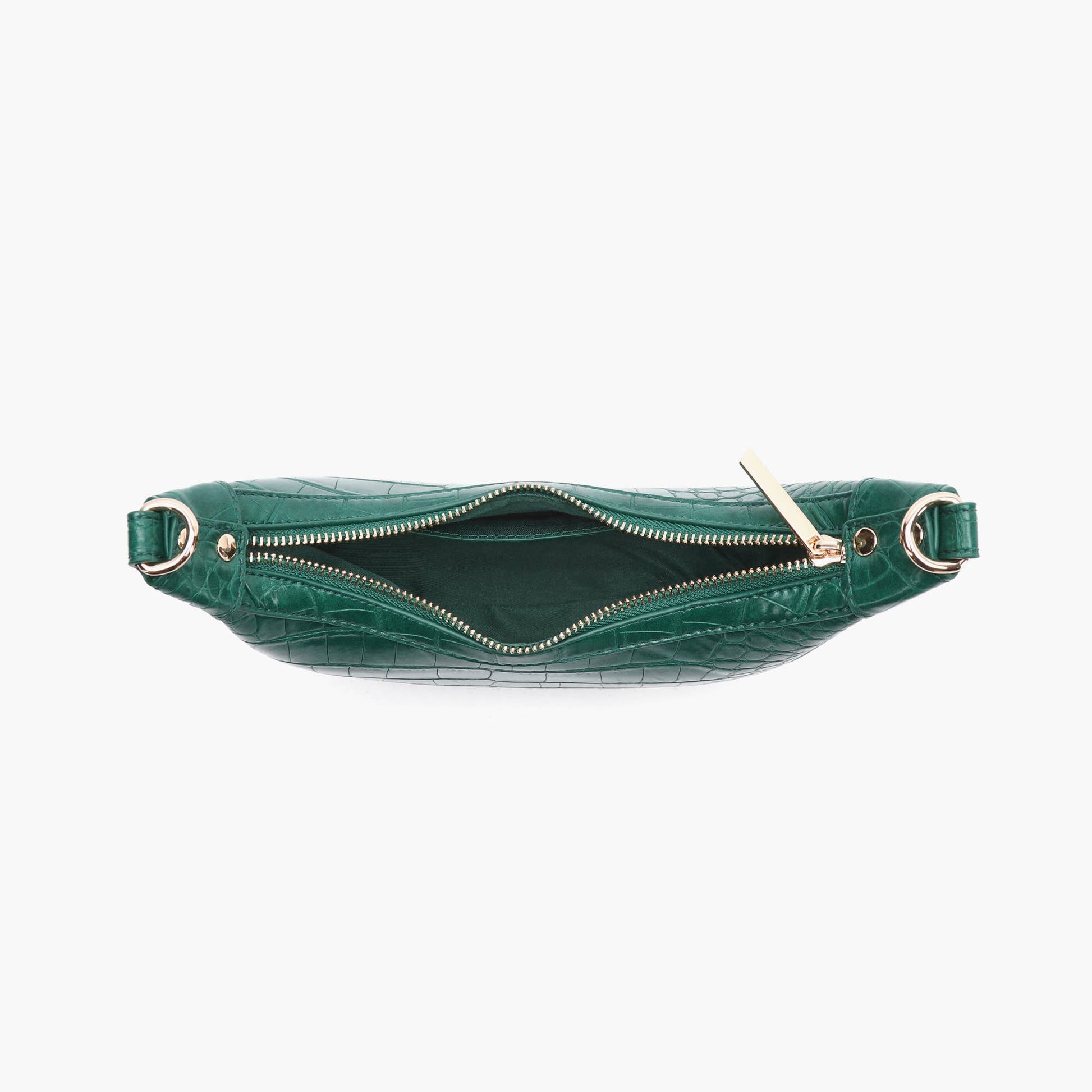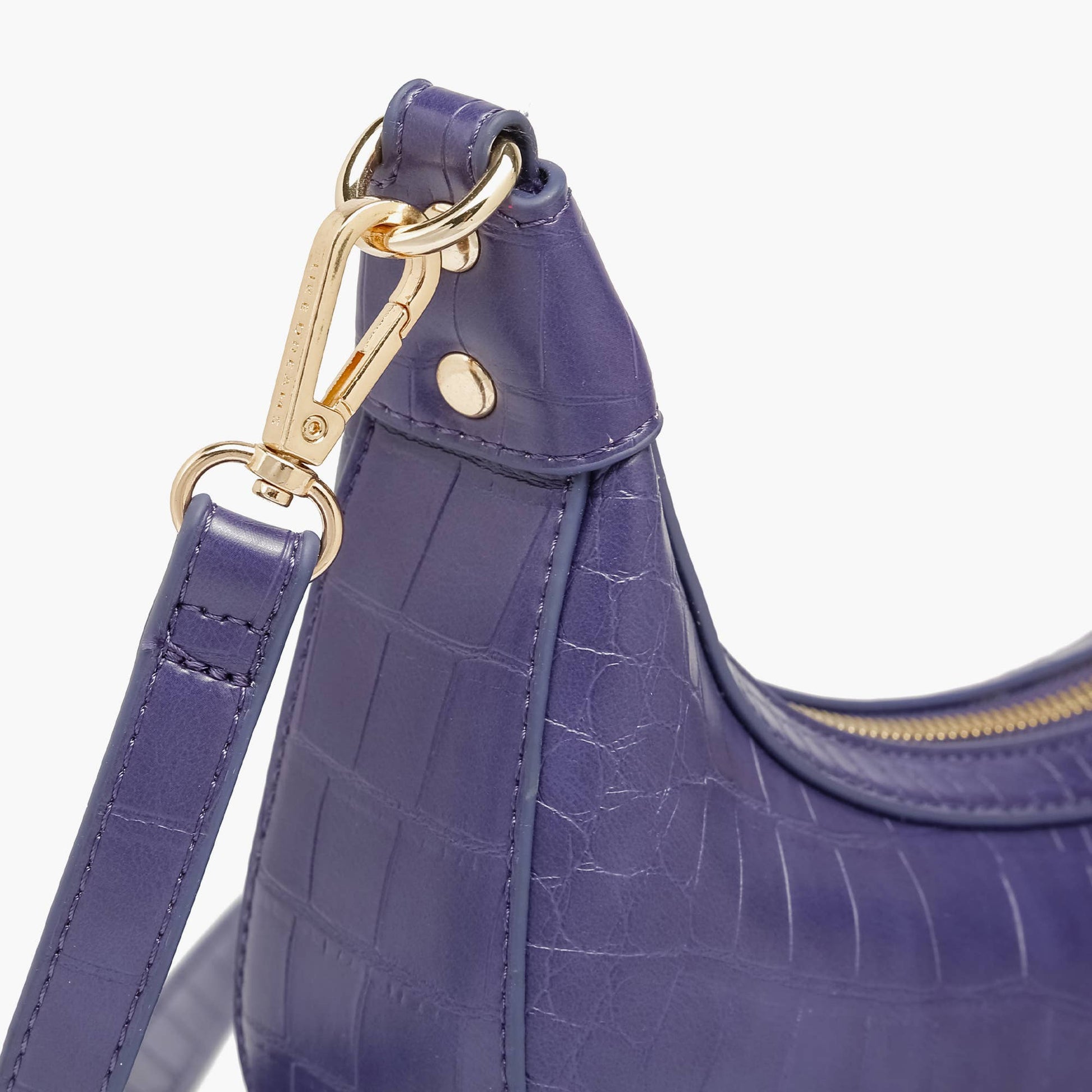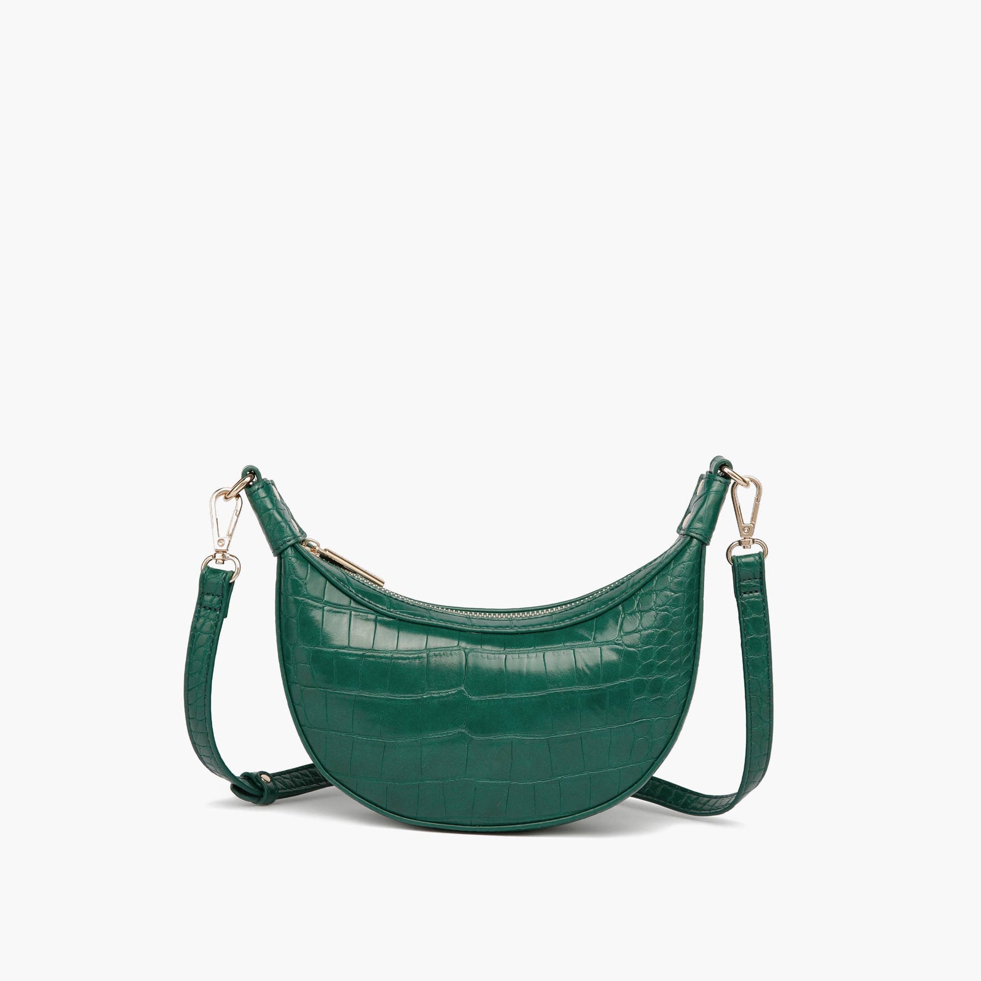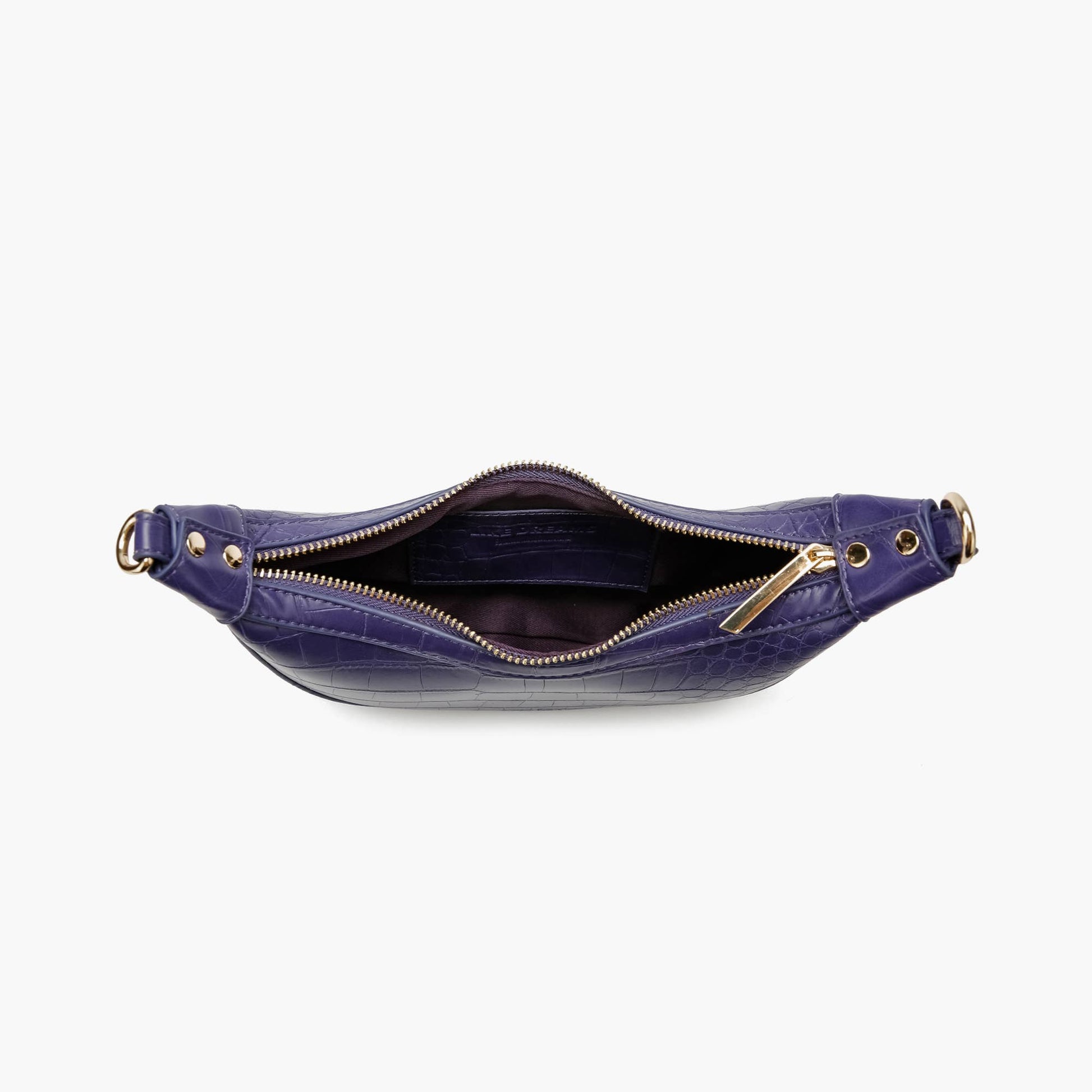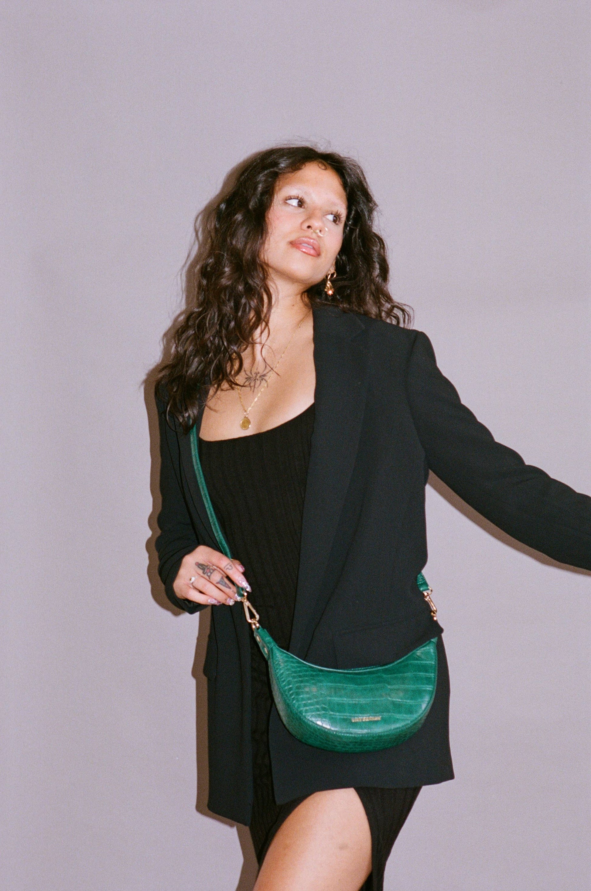 The Kouyou purse is a compact crescent shaped shoulder bag composed of faux croc vegan leather and gold hardware detailing. A detachable strap for crossbody or shoulder bag wear. Single compartment opening. Fits smaller daily essentials.