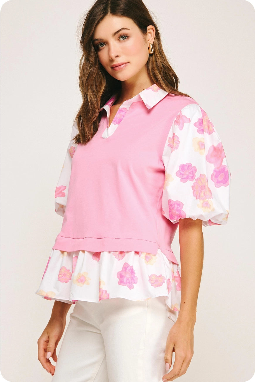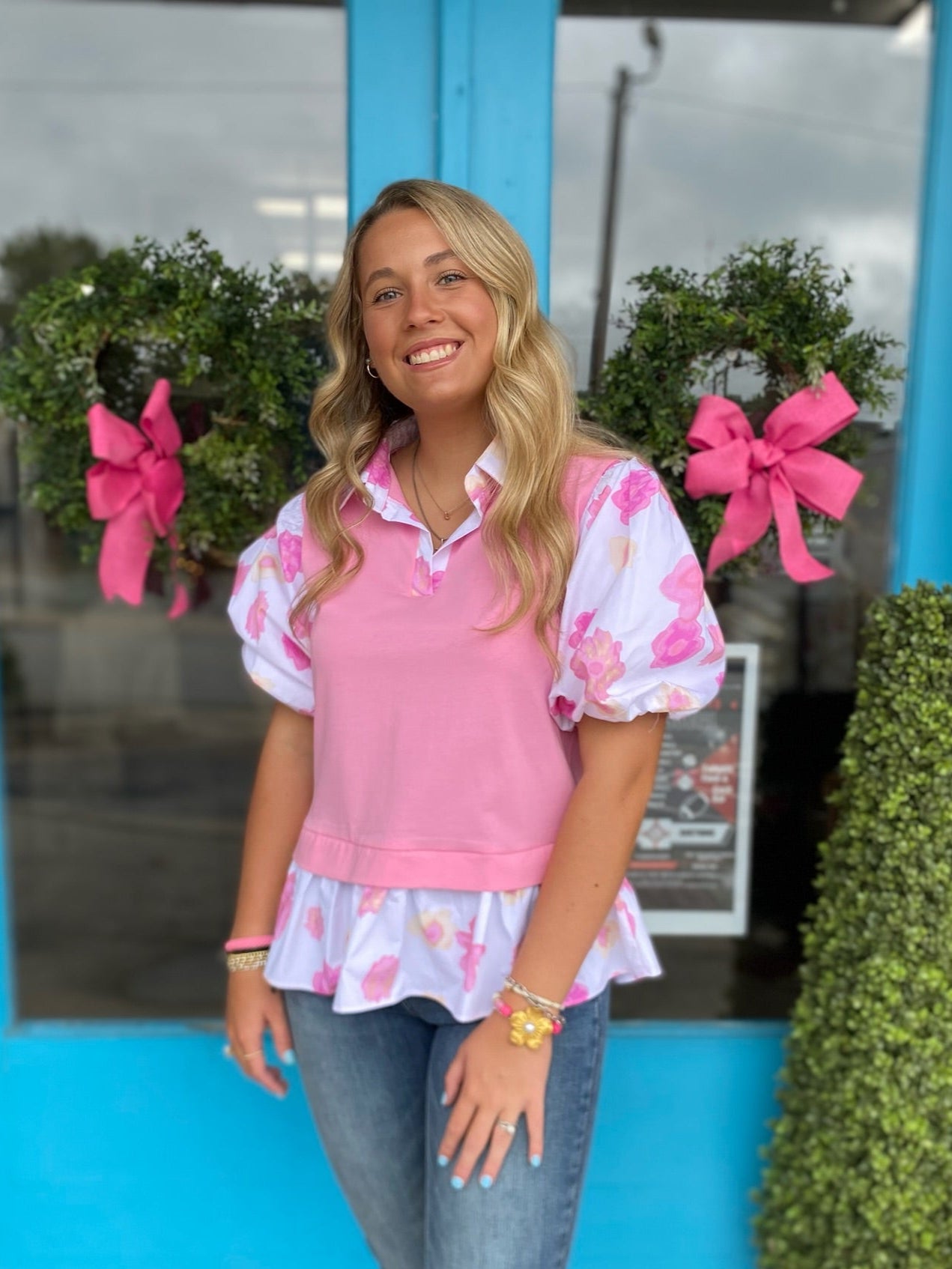 This perfect pink top features soft pink floral patterns on the sleeves and a flattering V-neck with a collar, combining fun and comfort.