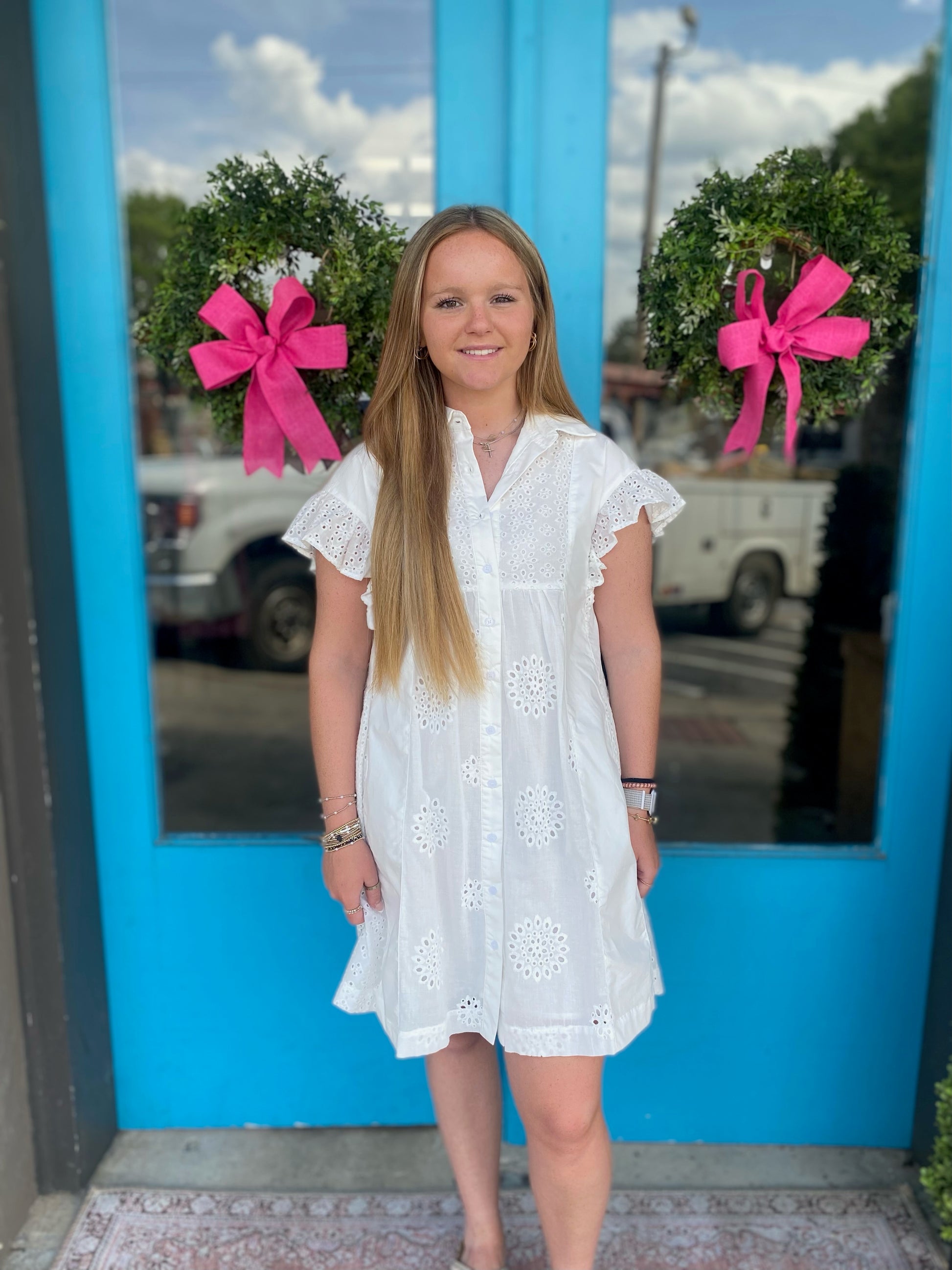 Elevate your style with Laural's Eyelet Poplin Dress. Made with high-quality poplin fabric, this dress features intricate eyelet detailing, adding a touch of elegance to your wardrobe. Stay comfortable and trendy with this versatile piece for any occasion.