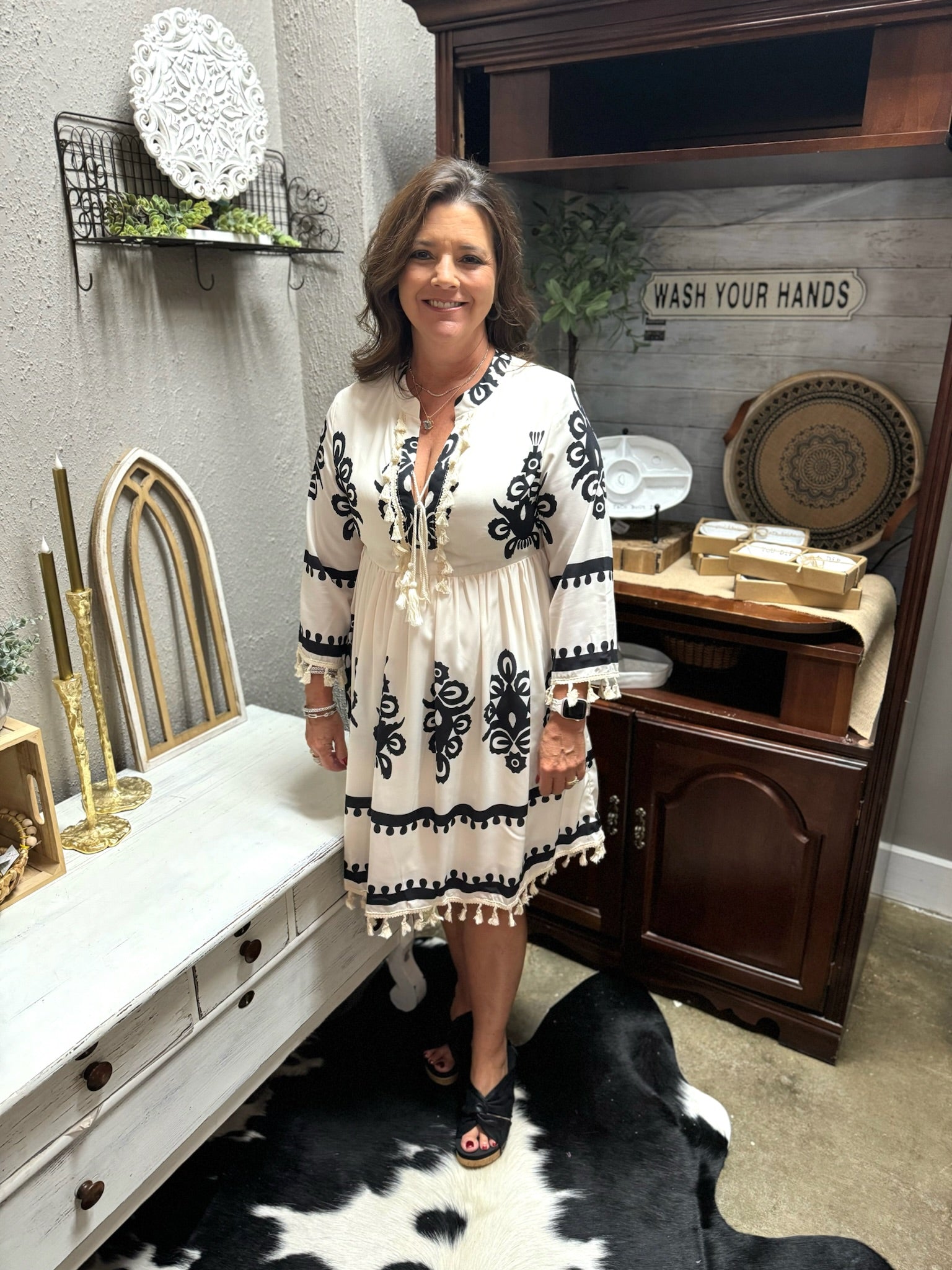 Embrace western charm with this patterned mini dress. Tasseled notch V-neck adds a playful touch to the design. Perfect for a fun day out or a casual evening gathering. Effortlessly stylish and comfortable to wear. A must-have piece for your wardrobe.