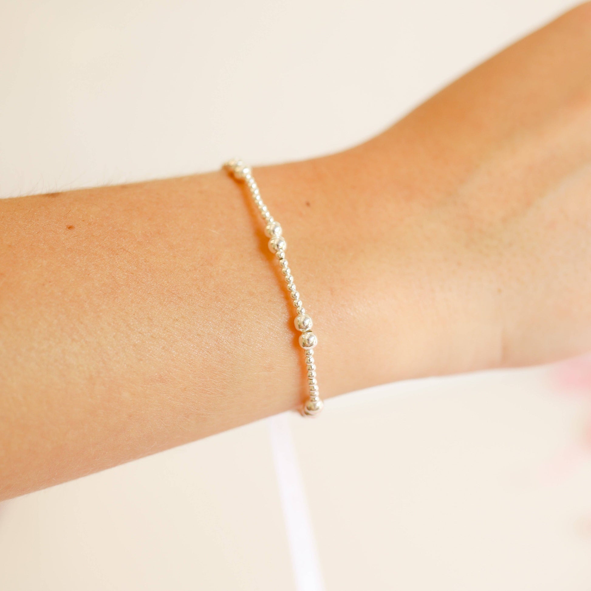 Beaded Blondes silver stackable beaded bracelets with 2mm + 4mm pattern.