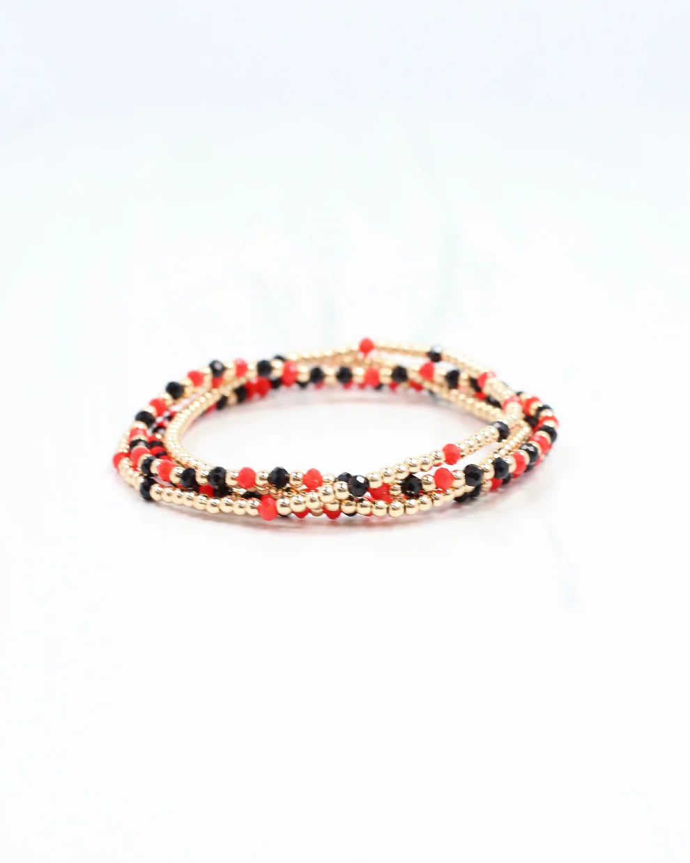 Add a pop of sparkle and team spirit with the Lottie Beaded Bracelet set in Black and Red! Featuring four stretchy strands adorned with gold and colorful glass beads, these bracelets are perfect for stacking and mixing with your favorite accessories. Comfortable and flexible, they fit most wrists with ease.