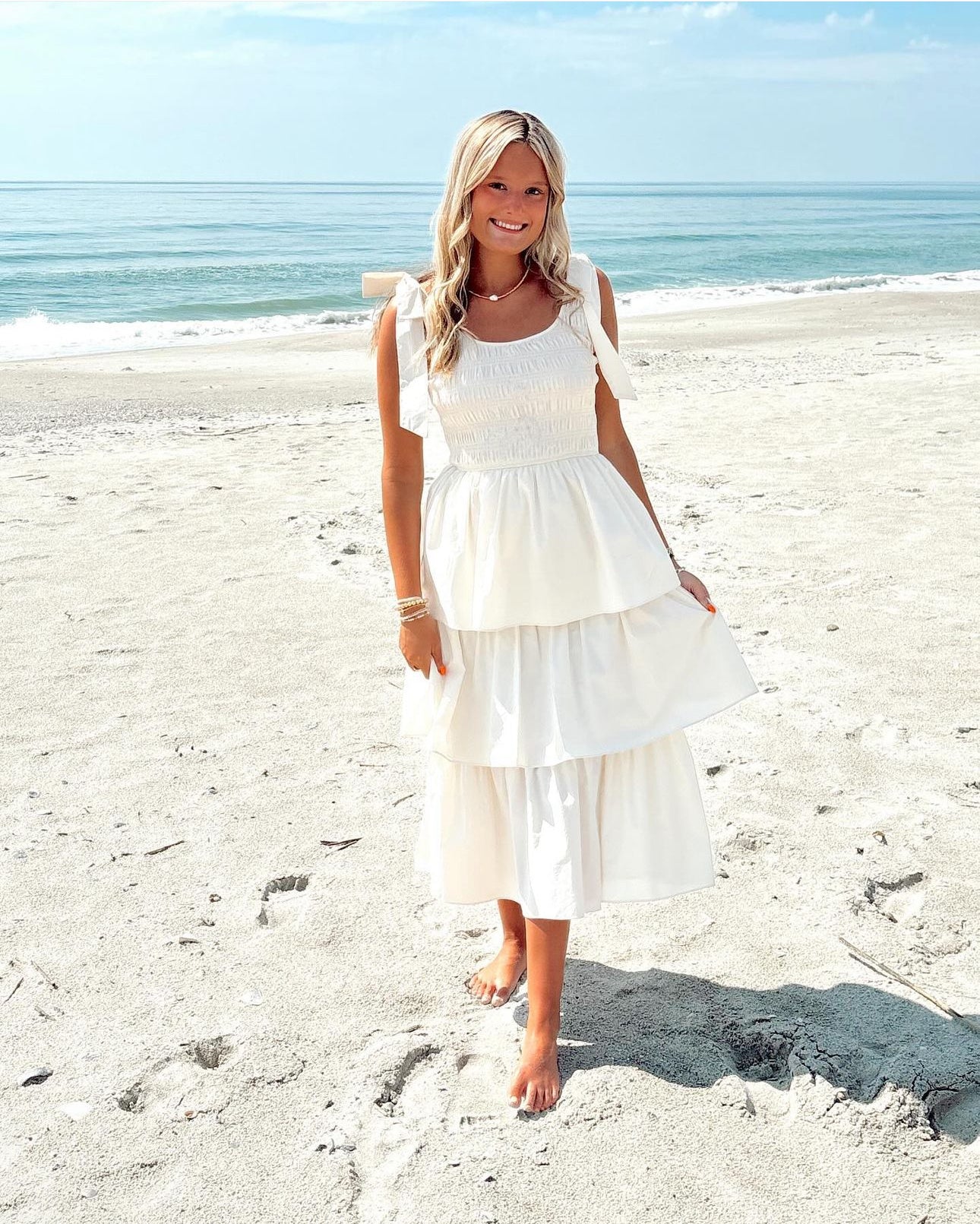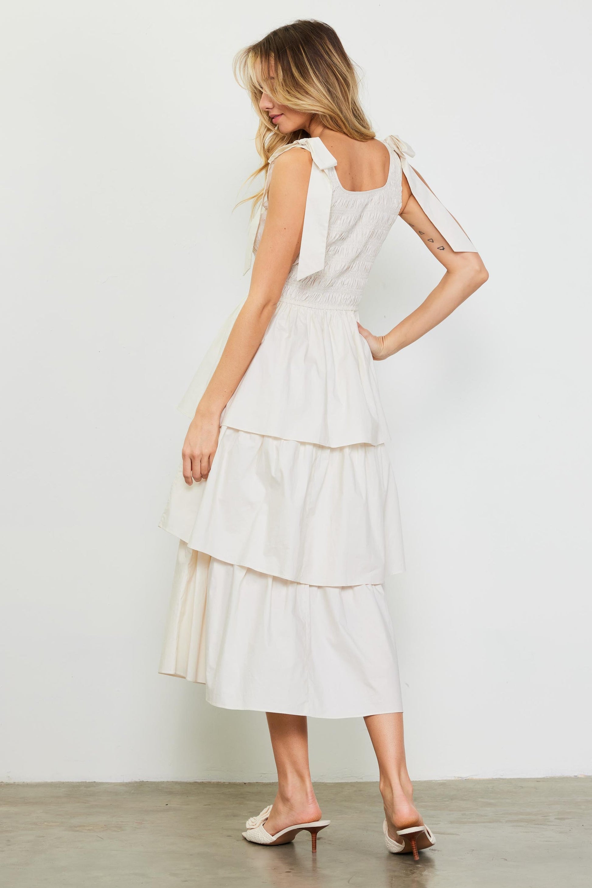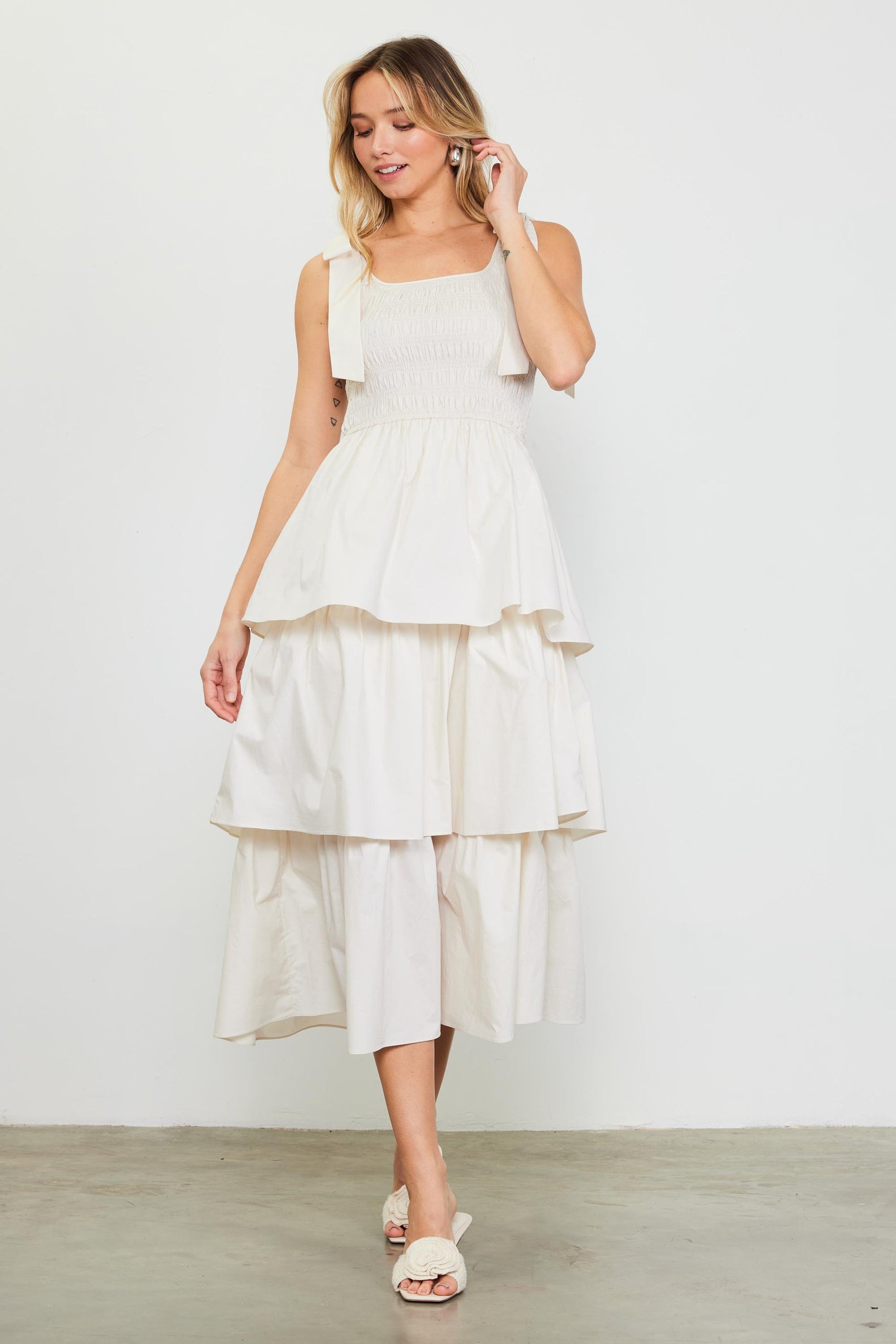 A dose of feminine whimsy for bringing levity to the season's occasions. Accented by playful bows at the shoulders, this dress has a smocked bodice balanced by a skirt of ruffled tiers.