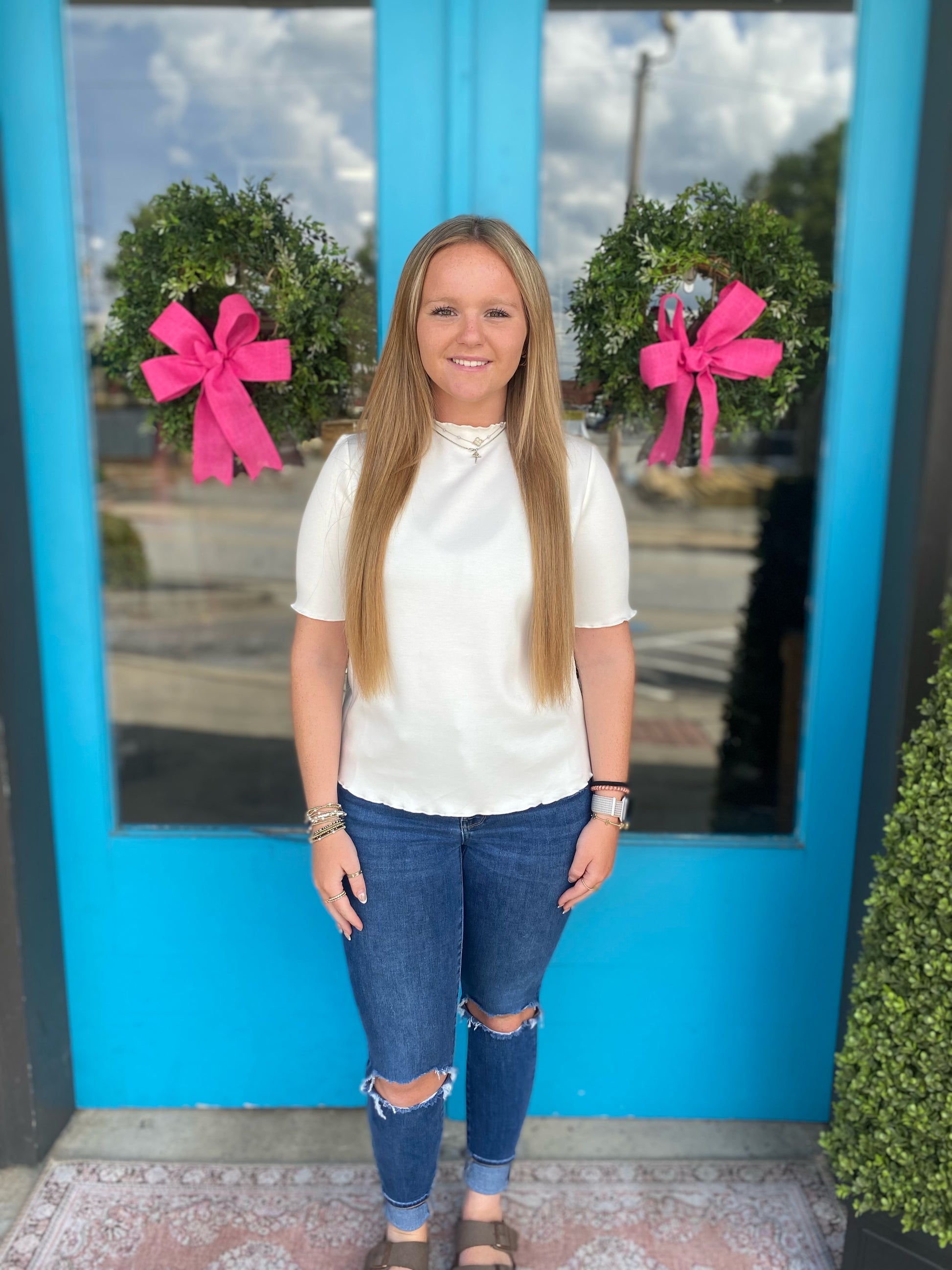 Effortlessly elevate your style with our P. Cill Frilly Hem Top in Ivory. This top features a delicate frilly hem that adds a touch of femininity to any outfit. Perfect for any occasion, our top is a versatile addition to your wardrobe.