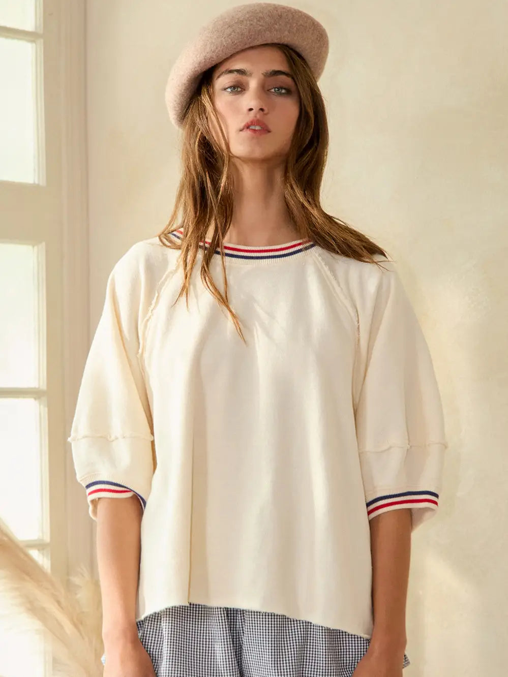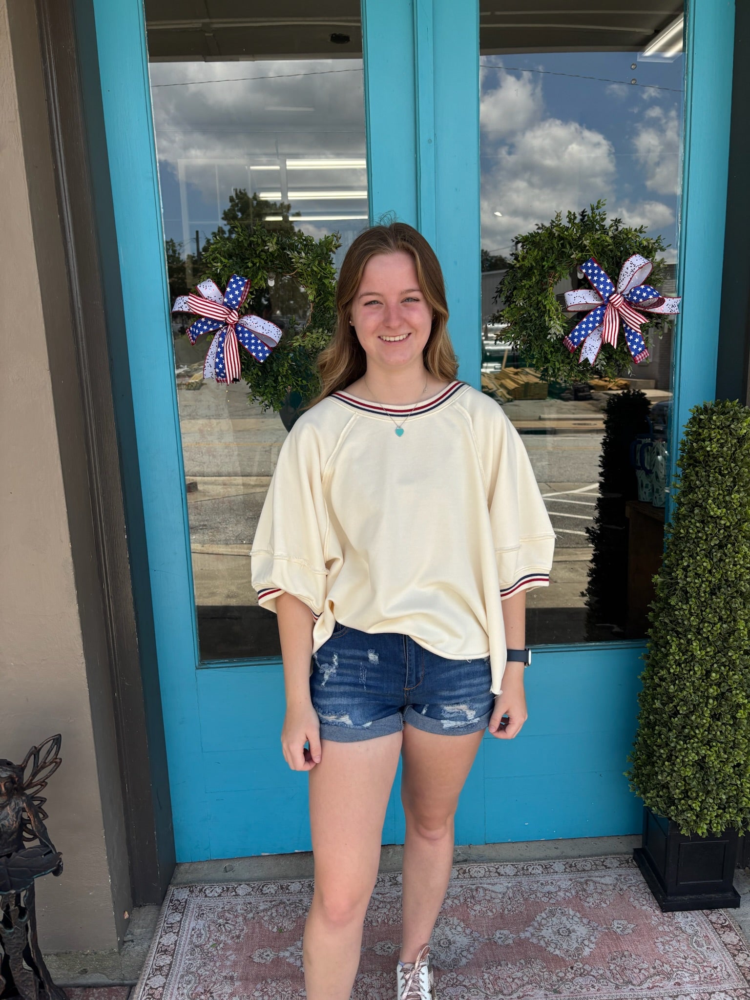 Celebrate your patriotism in style with our Patriotic Banded Top! This ivory top features a band of red and blue stripes, making it the perfect outfit for any national holiday or event. Show off your love for your country with this trendy and unique top.