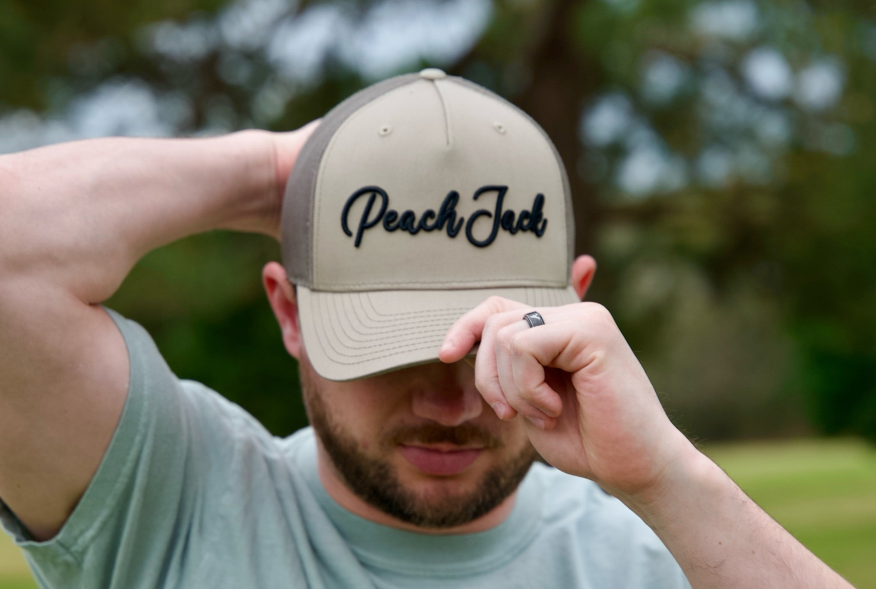 Pale Green Khaki/Loden Five Panel Trucker With A Raised Peach Jack Script
