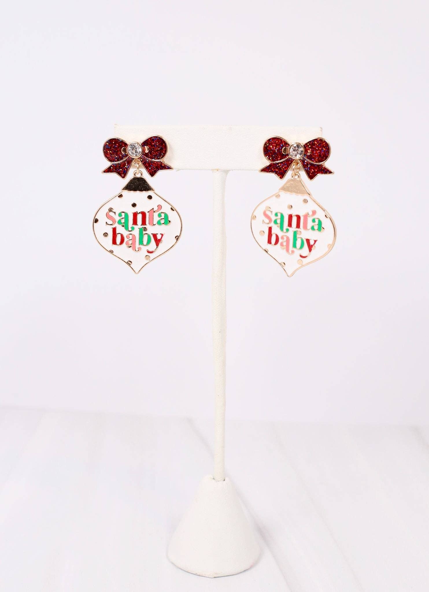 This Christmas themed earring is so adorable! It is shaped like an ornament with a red bow post. It has 'Santa baby' on the front for an extra cute detail.