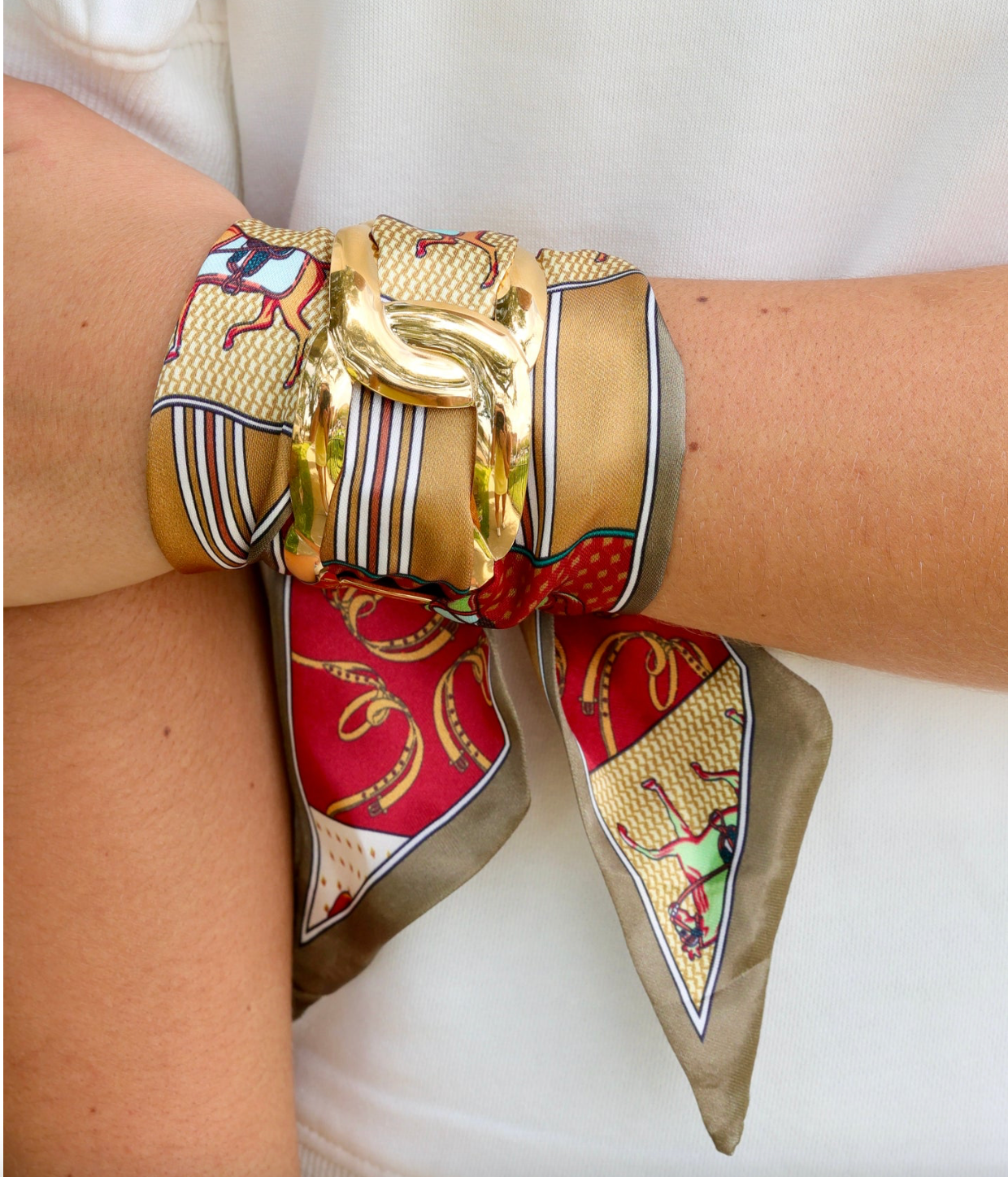 Elevate your style with the Sedgefield Scarf Bracelet. This fashionable accessory features a sleek stainless steel adjustable cuff intertwined with a vibrant scarf, adding a stunning pop of color to your wrist. Perfect for effortlessly enhancing any outfit with a chic, modern touch.