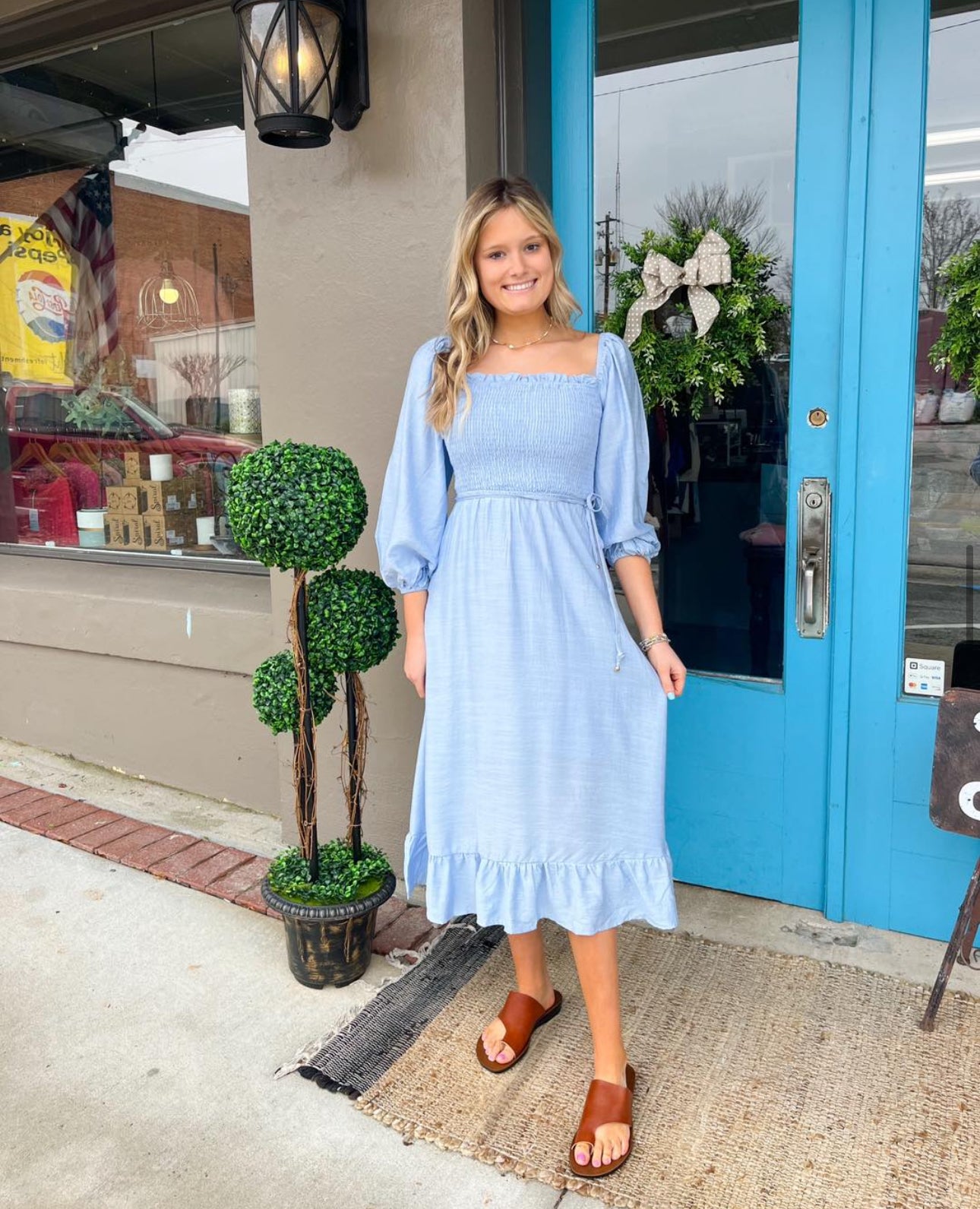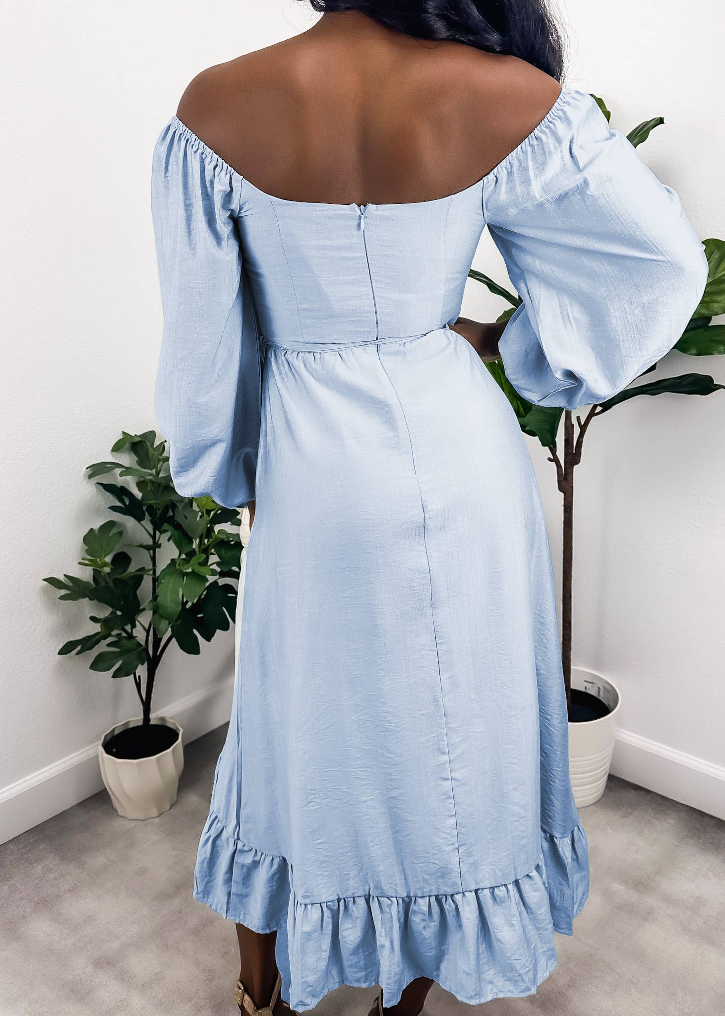 The Anna-Kaci dress is detailed with gorgeous bishop sleeves. Features a square neck line, shirred bodice, flowy skirt, ruffle hem, and mid-calf length. Pair it with layered necklaces and kitten heels for a feminine look.