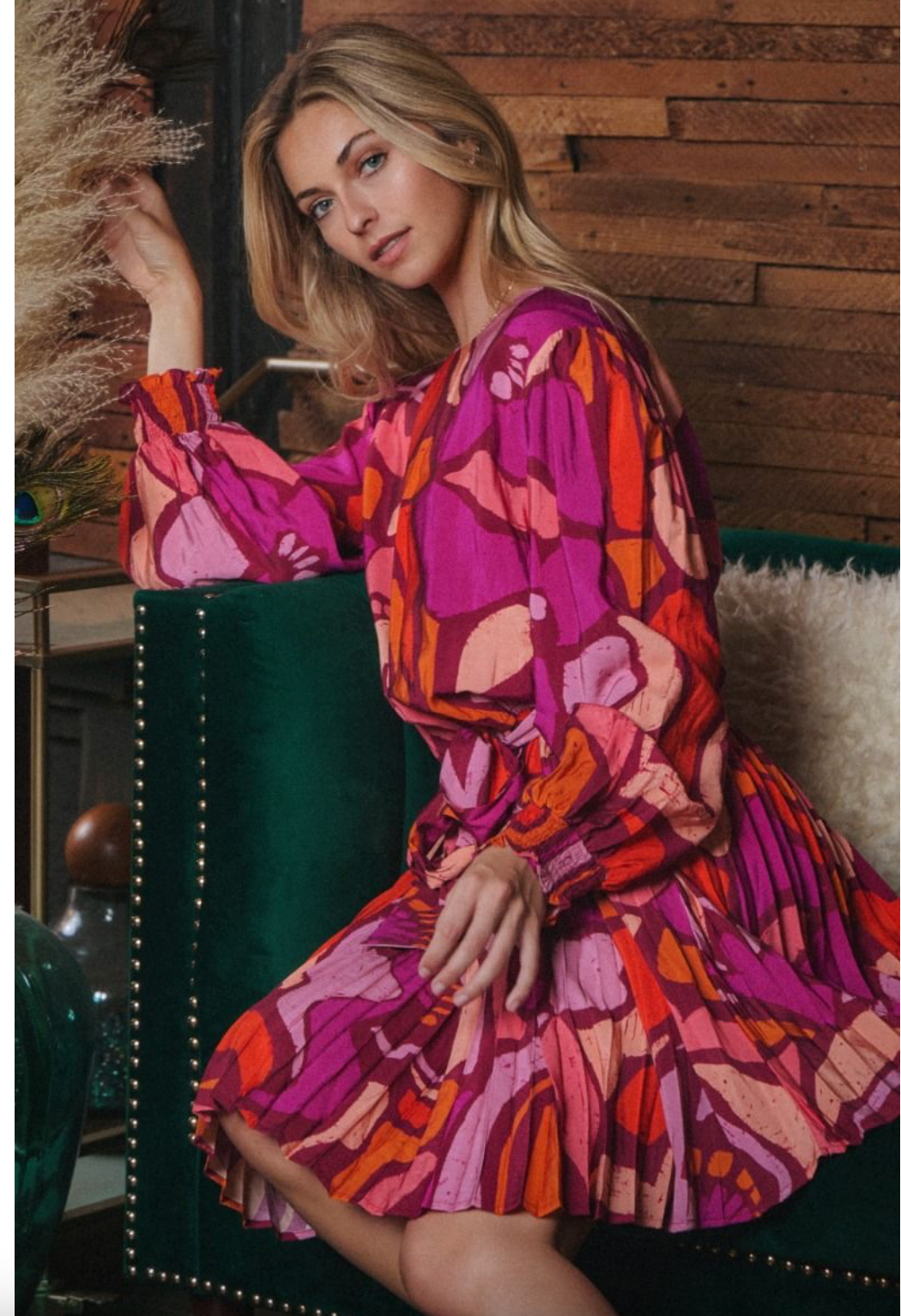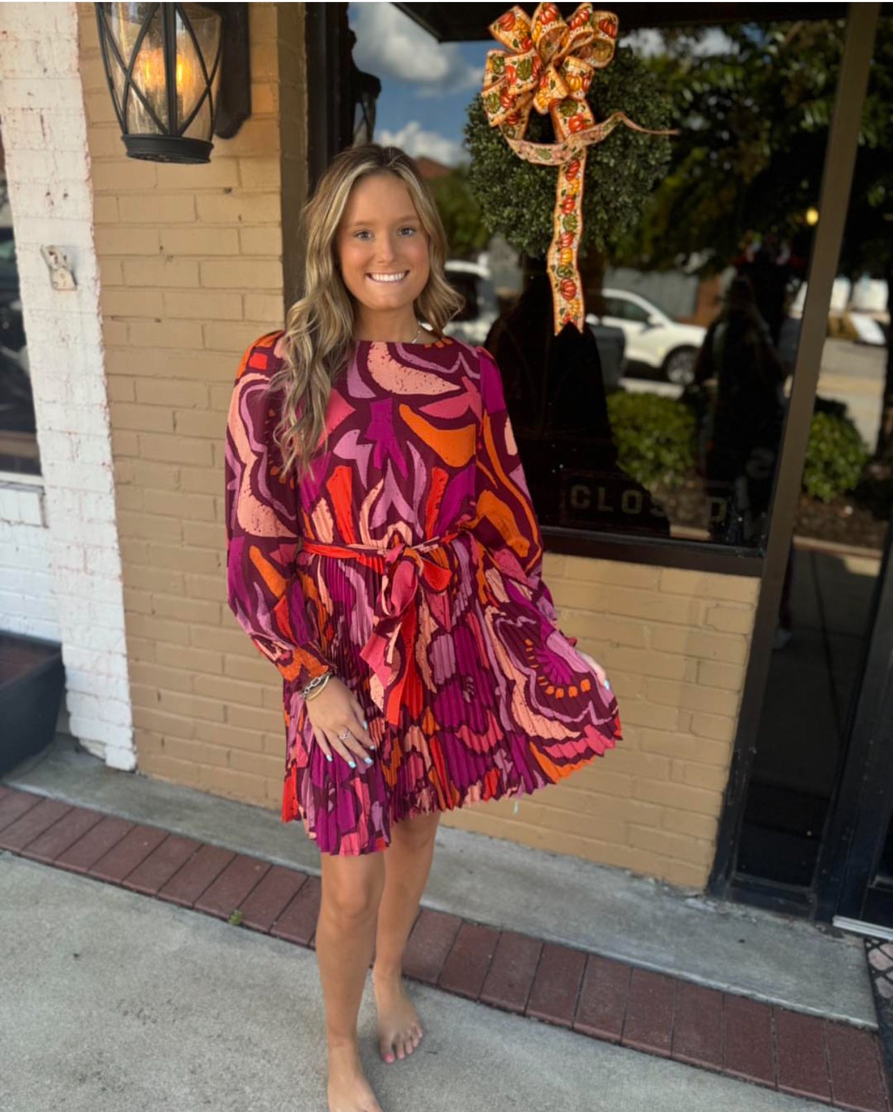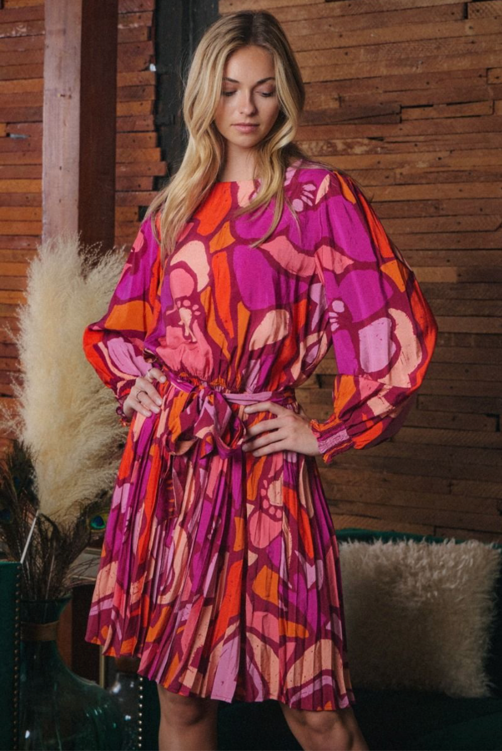 Geo printed boat neck long sleeve pleated mini dress with belt. Perfect for all season and any occasion, makes this dress a MUST!!!