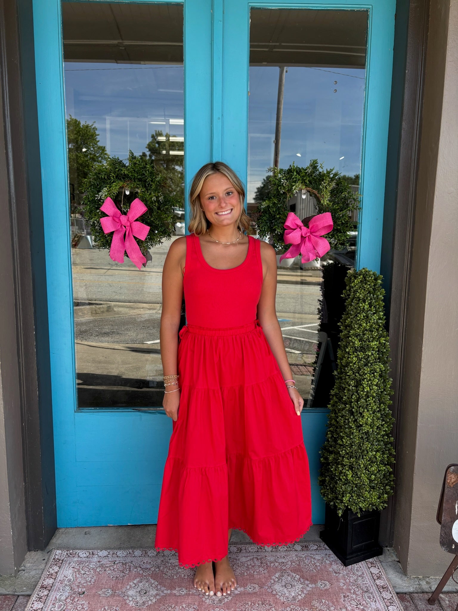 Vibrant red cotton midi dress, sleeveless for an effortless summer style. Breathable fabric keeps you cool while the versatile length transitions easily from day to evening wear.
